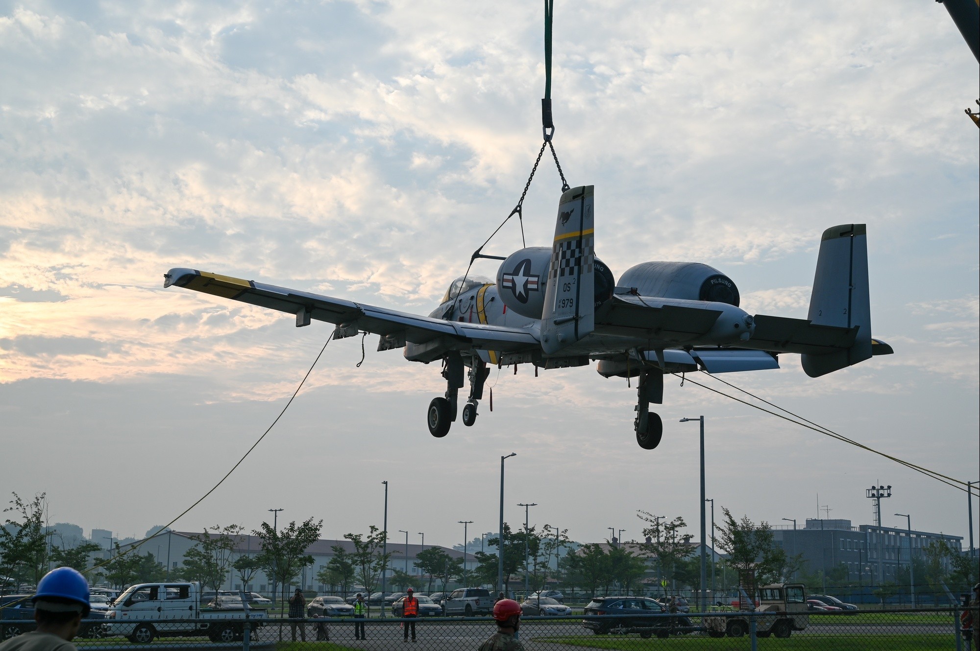 An A-10 Thunderbolt II aircraft gets lifted into position to be escorted down to be put on display at a traffic circle on Camp Humphreys, South Korea, August 2, 2025. The A-10 was being put on display as it was being decommissioned. (U.S. Army photo by Pfc. Seu Chan)