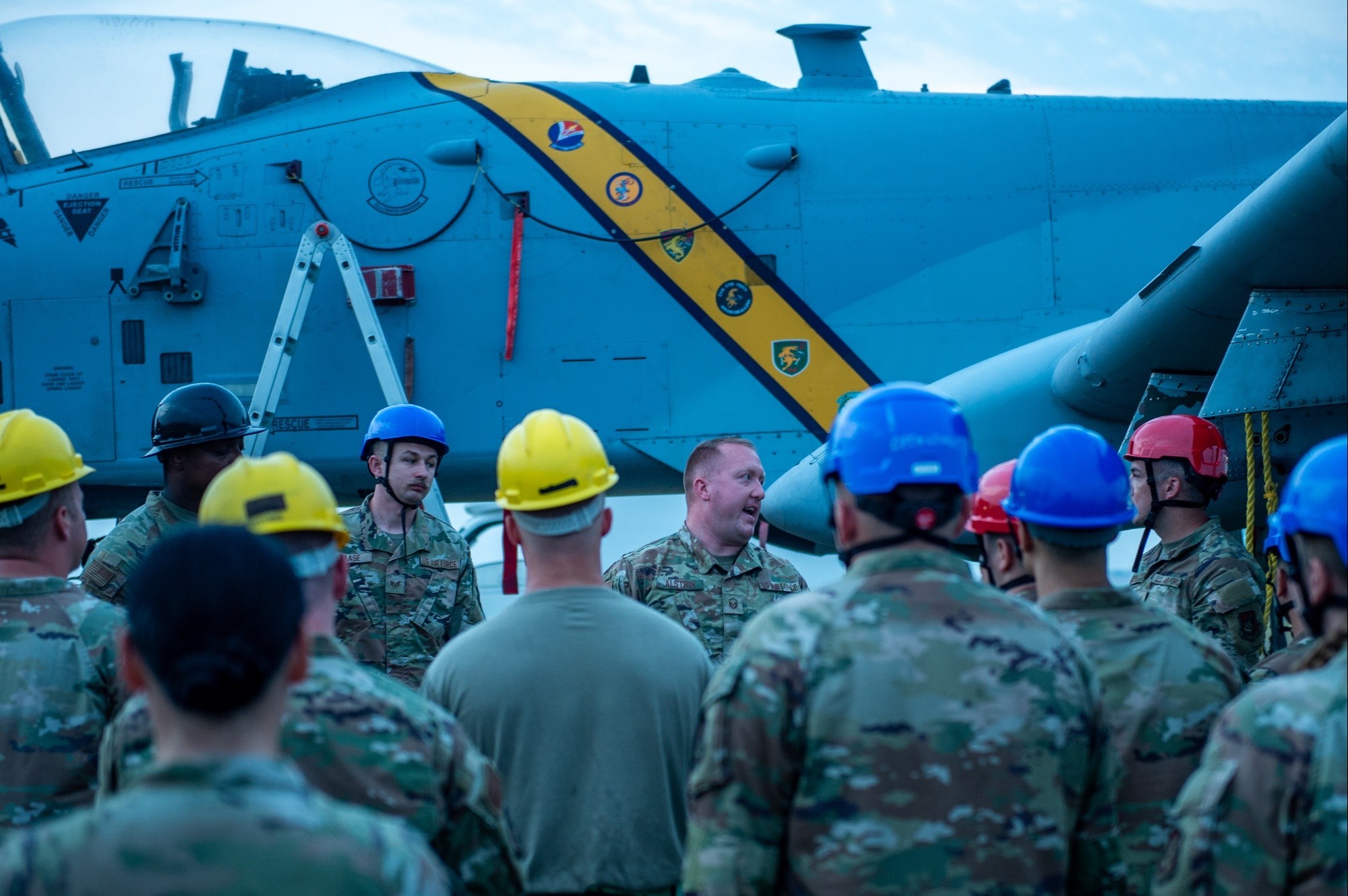 U.S. Air Force Master Sgt. Michael Alstrin, crash recovery section chief, 51st Maintenance Squadron, gives a safety brief to U.S. Air Force Airmen from the 25th Fighter Generation Squadron and 51st Maintenance Squadron, U.S. Army Soldiers from 2nd Combat Aviation Brigade, 2nd Infantry ROK/U.S. Combined Division and personnel from U.S. Army Garrison Humphreys before an aircraft lift operation on Camp Humphreys, South Korea, August 2, 2025. The joint force team worked together to install a decommissioned A-10 Thunderbolt II aircraft on a traffic circle. (U.S. Army photo by Richard Kim)