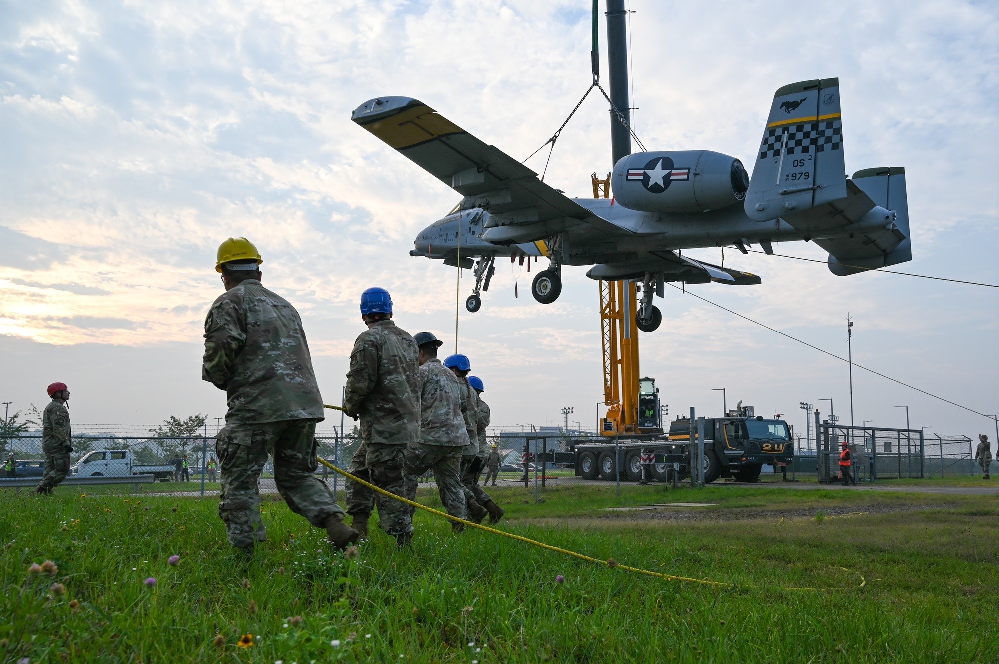 An A-10 Thunderbolt II aircraft gets lifted as U.S. Air Force Airmen from the 25th Fighter Generation Squadron and 51st Maintenance Squadron, U.S. Army Soldiers from 2nd Combat Aviation Brigade, 2nd Infantry and personnel from U.S. Army Garrison Humphreys observe the situation on Camp Humphreys, South Korea, August 2, 2025. The joint force team worked together to install a decommissioned A-10 Thunderbolt II aircraft on a traffic circle. (U.S. Army photo by Richard Kim)