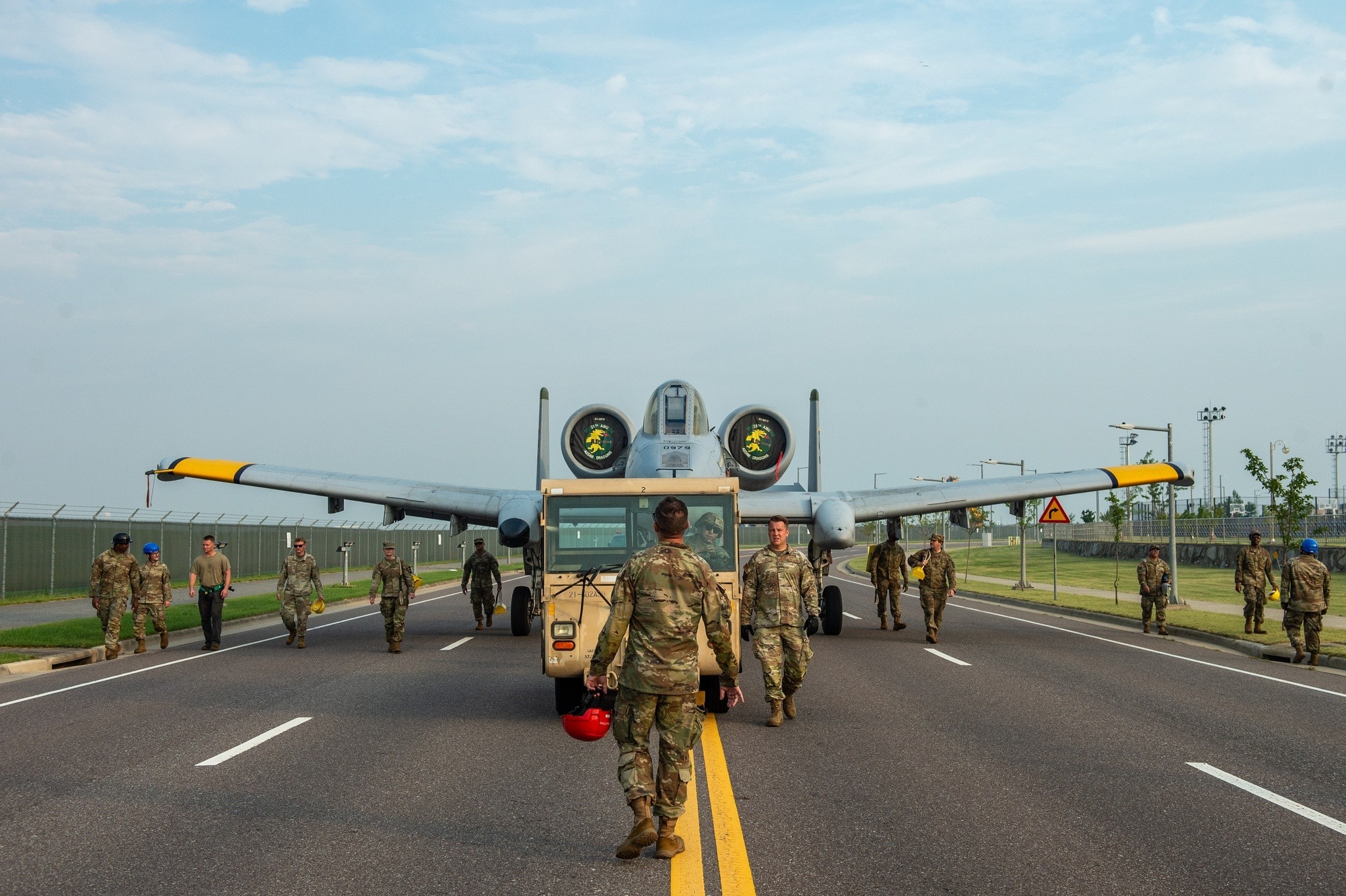 An A-10 Thunderbolt II aircraft gets towed as U.S. Air Force Airmen from the 25th Fighter Generation Squadron and 51st Maintenance Squadron, U.S. Army Soldiers from 2nd Combat Aviation Brigade, 2nd Infantry and personnel from U.S. Army Garrison Humphreys escort and guide the aircraft down the road on Camp Humphreys, South Korea, August 2, 2025. The joint force team worked together to install a decommissioned A-10 Thunderbolt II aircraft on a traffic circle. (U.S. Army photo by Richard Kim)
