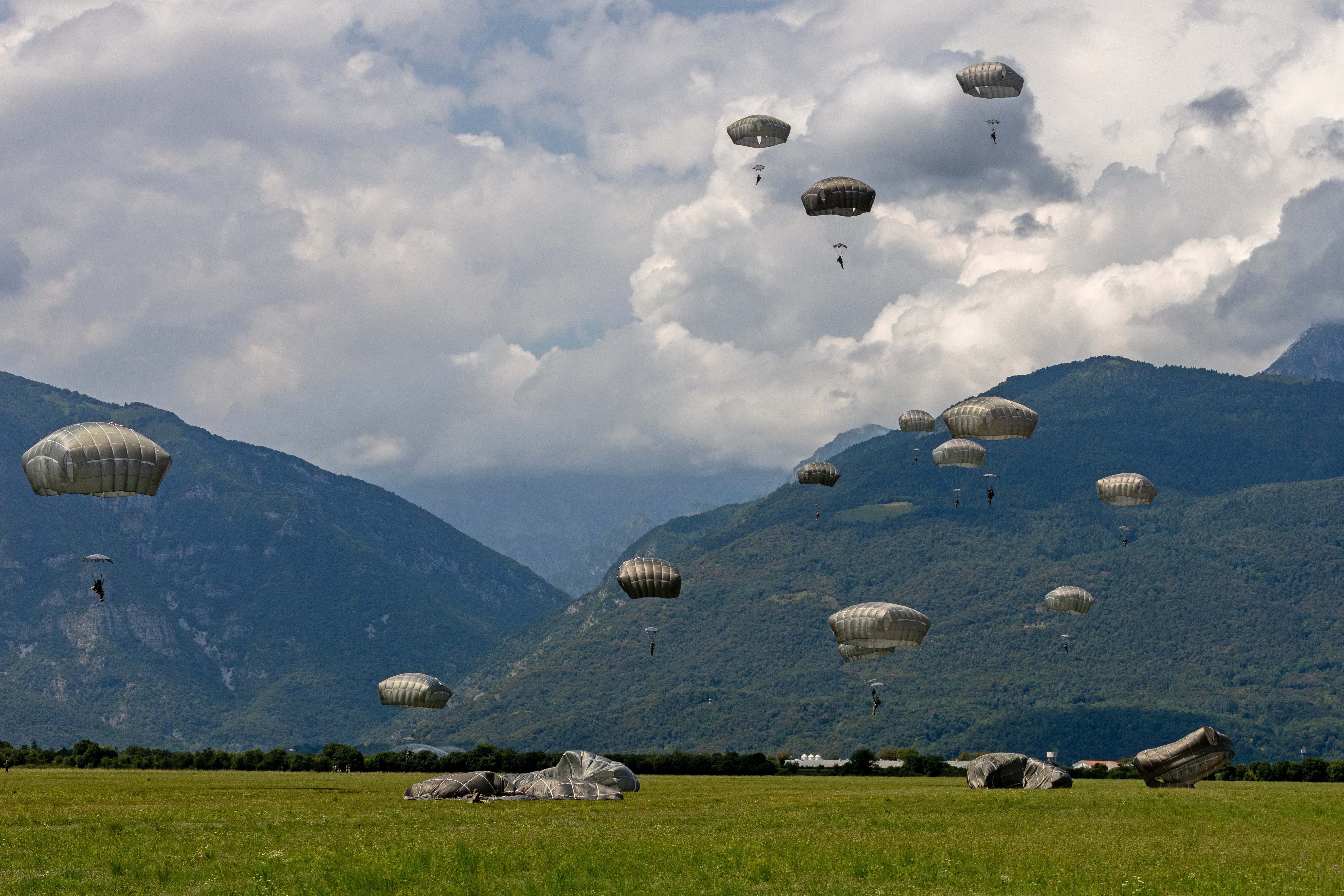 U.S. Army paratroopers assigned to 2nd Battalion, 503rd Infantry Regiment, 173rd Airborne Brigade, conduct an airborne jump out of a C-130 Hercules aircraft at Juliet Drop Zone, Aviano, Italy, July 22, 2025. The 173rd Airborne Brigade is the U.S. Army Contingency Response Force in Europe, capable of projecting ready forces anywhere in the U.S. European, Africa or Central Commands’ areas of responsibility. (U.S. Army photo by Spc. James Robinson)