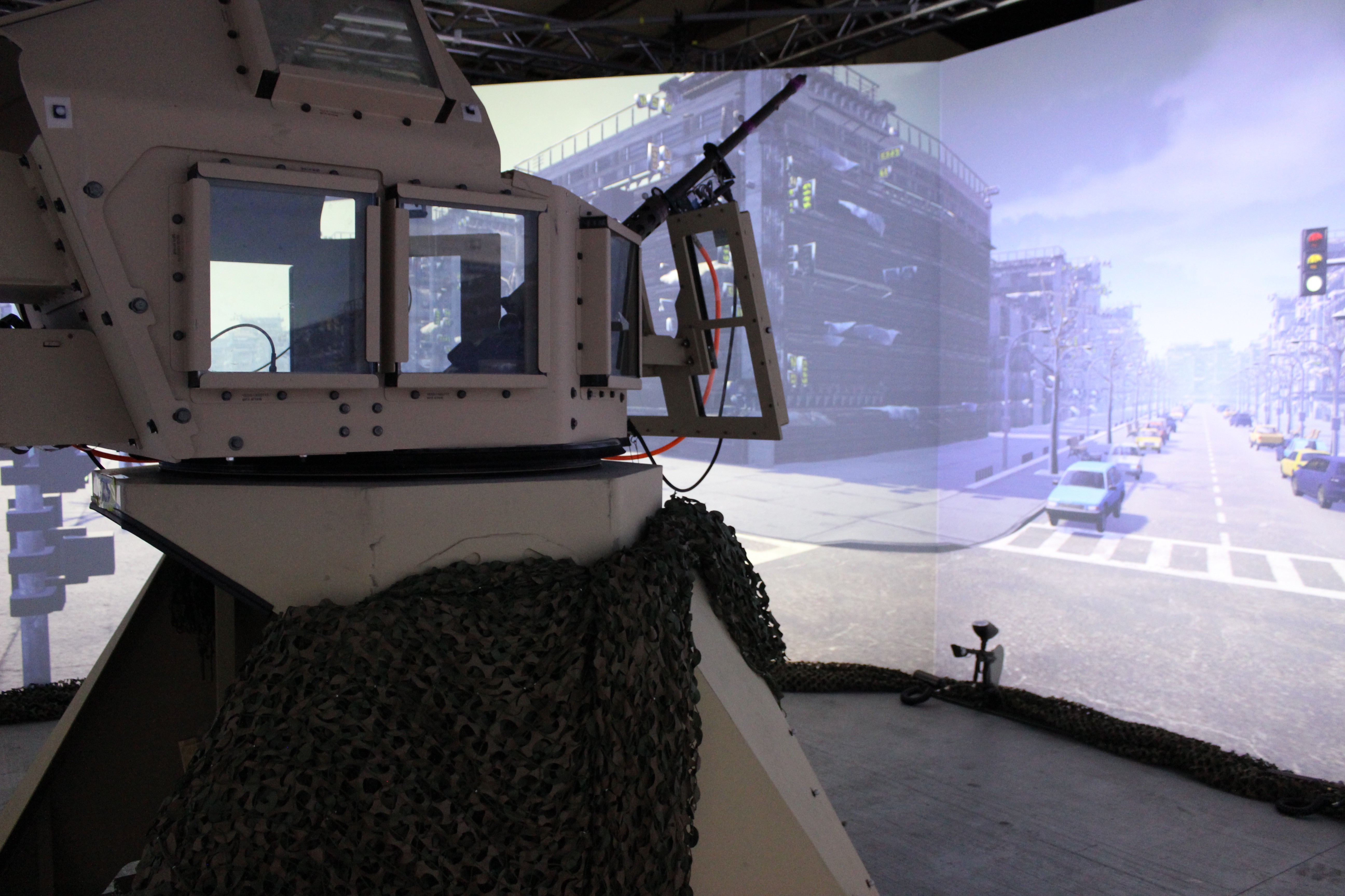 The second testbed required participants to be located inside a mock GPK, operating as if it was the real system. The environment consisted of eight 4K projectors, displaying the environment within an octagon displaying a 360-degree view around GPK. The GPK was armed with a de-milled M2 machine gun modified for use in virtual environments. The de-milled M2 provided some recoil and allowed for reloading and targeting withing the virtual environment. Additionally, rubber pellets were fired from virtual enemy positions aimed at the base of the kit to simulate incoming enemy fire.
