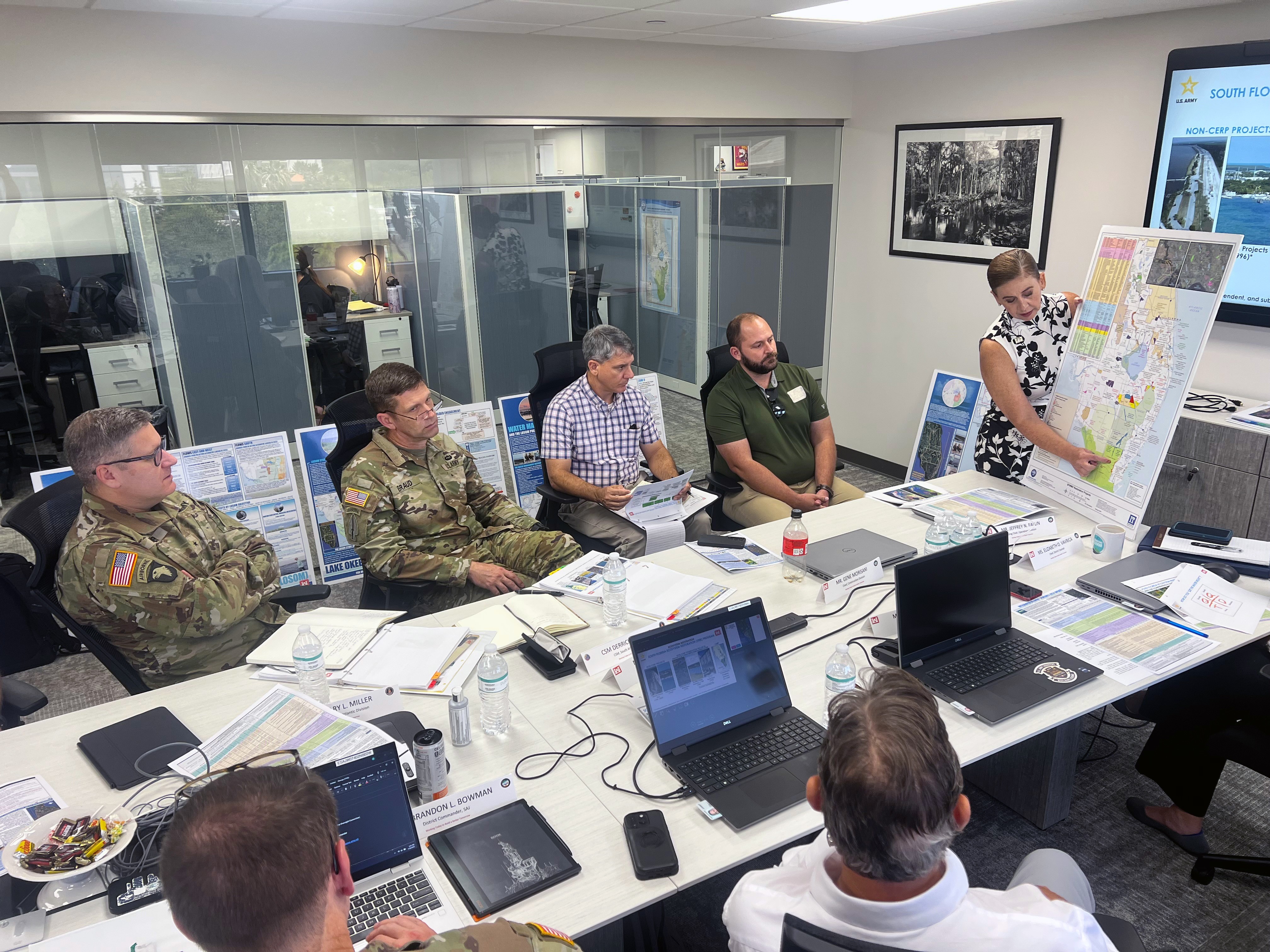 Eva Velez, the Chief Ecosystem Branch for the Everglades Restoration, updates Brig. Gen. Zachary Miller, U.S. Army Corps of Engineers South Atlantic Division commander, and his team on the Central Everglades Restoration Program during a briefing in the Palm Beach Gardens office during a recent visit to meet with leadership and employees and see district projects throughout Florida.