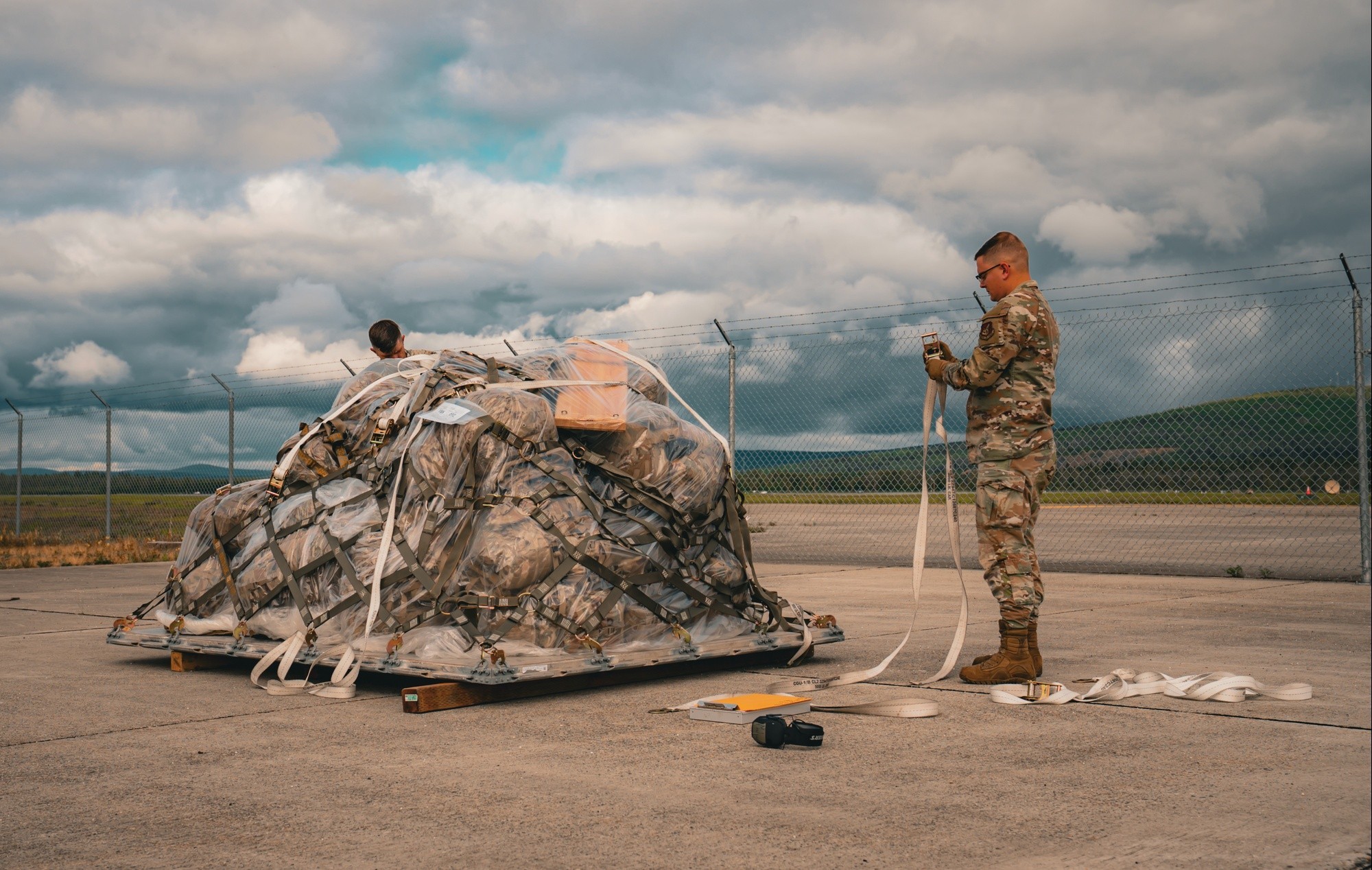 Airmen prepare equipment for transport on a U.S. Air Force C-17 Globemaster in Ft. Wainwright, Alaska, Aug. 2025. Soldiers assigned to 5th Squadron, 1st Cavalry Regiment, 1st Infantry Brigade Combat Team, 11th Airborne Division conducted an out-of-sector deployment readiness exercise to Kotzebue. The training validated the unit’s ability to rapidly deploy and operate in remote Arctic conditions. (U.S. Army photo by Correy Mathews)