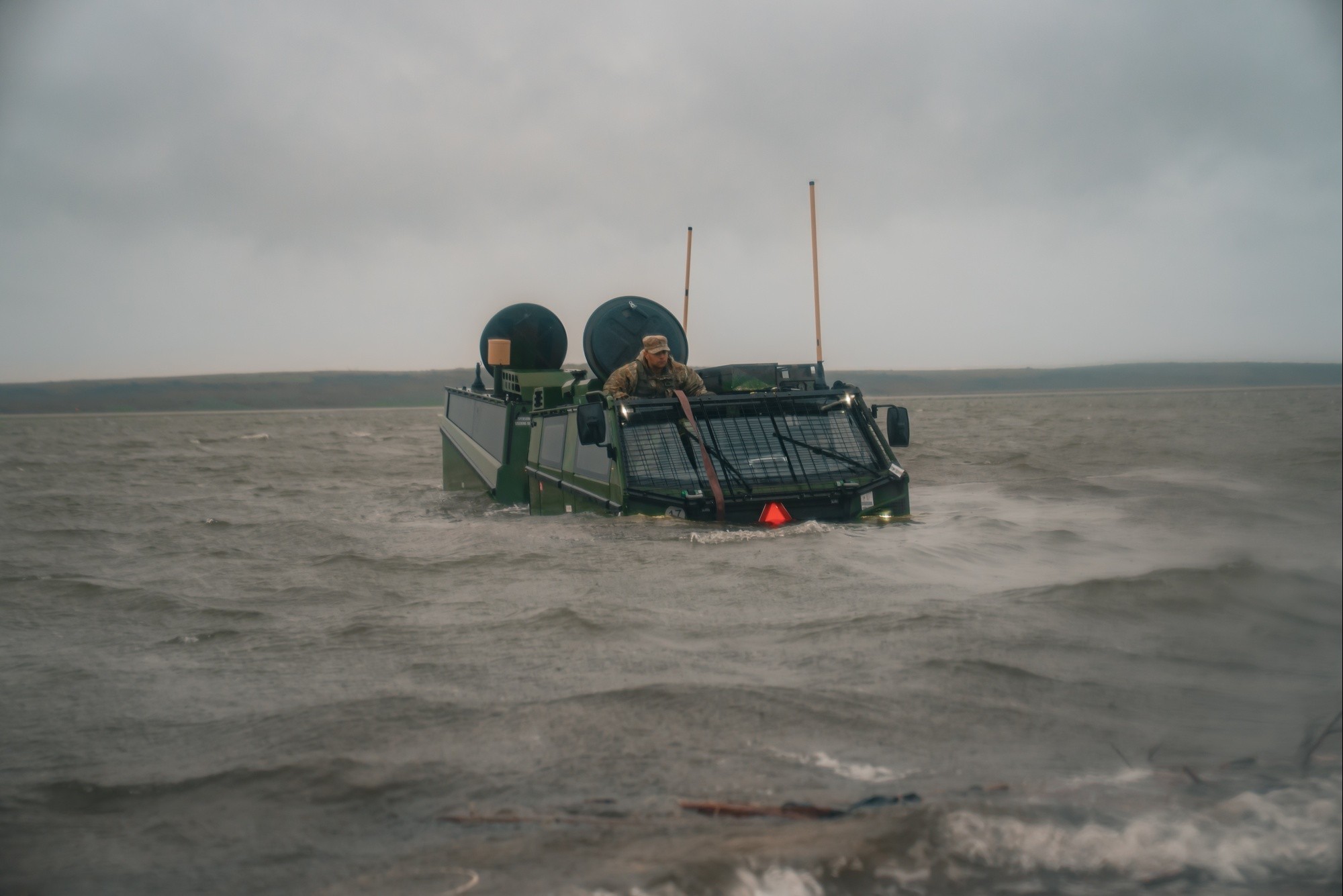 A Cold Weather All-Terrain Vehicle from the 11th Airborne Division enters the Arctic Ocean near Kotzebue, Alaska, Aug. 2025. 5-1 CAV from the 11th Airborne Division conducted an out-of-sector deployment readiness exercise to Kotzebue. The training validated the unit’s ability to rapidly deploy and operate in remote Arctic conditions.(U.S. Army photo by Correy Mathews)