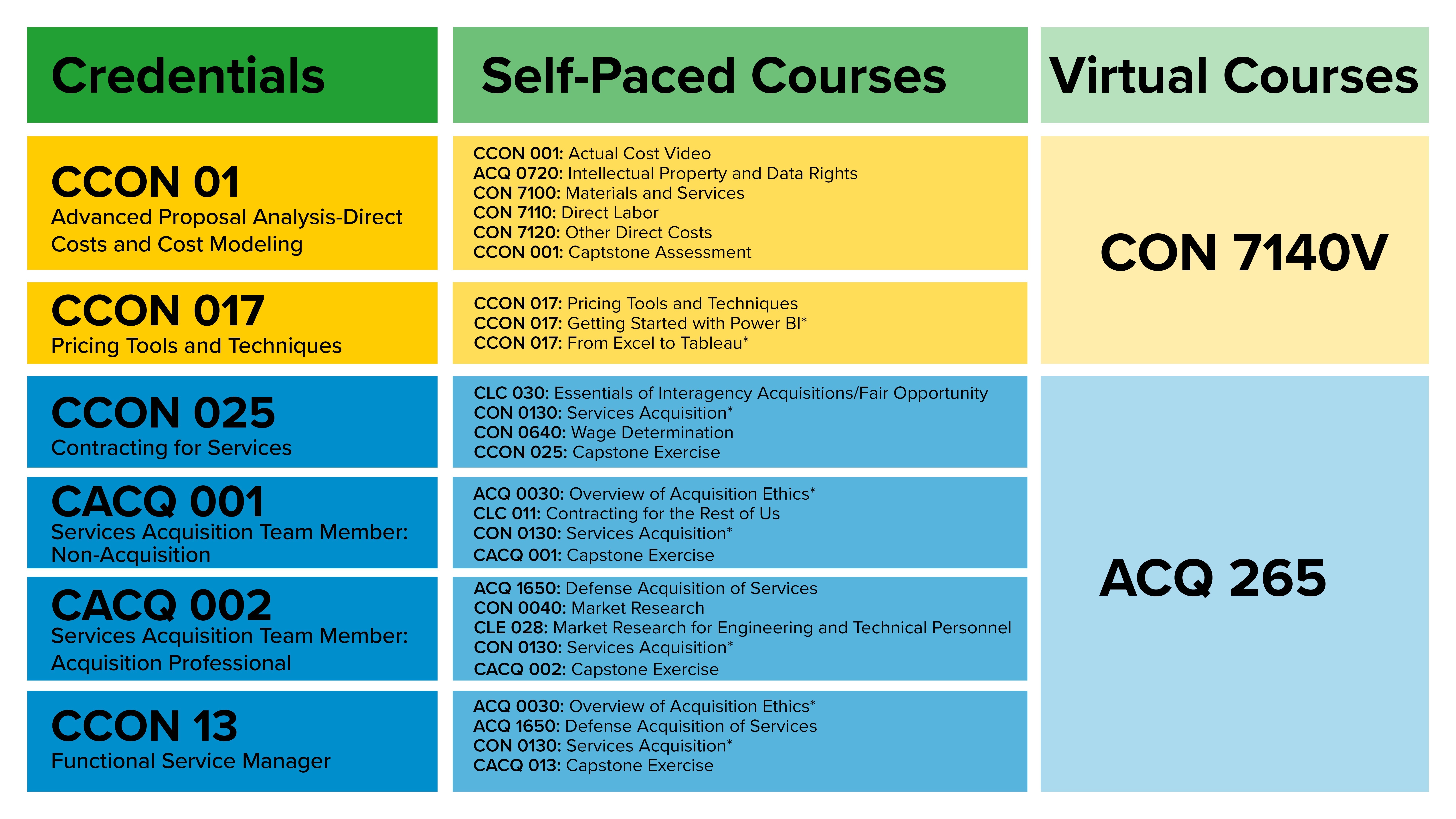 One thing to keep in mind is that several defense acquisition credentials have the same self-paced or virtual course. For example, these four credentials—Contracting for Services, Services Acquisition Team Member: Acquisition Professional, Services Acquisition Team Member: Non-Acquisition Professional and Functional Service Manager—all require one virtual course: ACQ 265. These credentials also have several self-paced courses in common. If you complete all applicable self-paced courses, then you only need to take one virtual course to gain more than one credential. This allows Soldiers to get extra training without hindering unit operations due to extended absences.