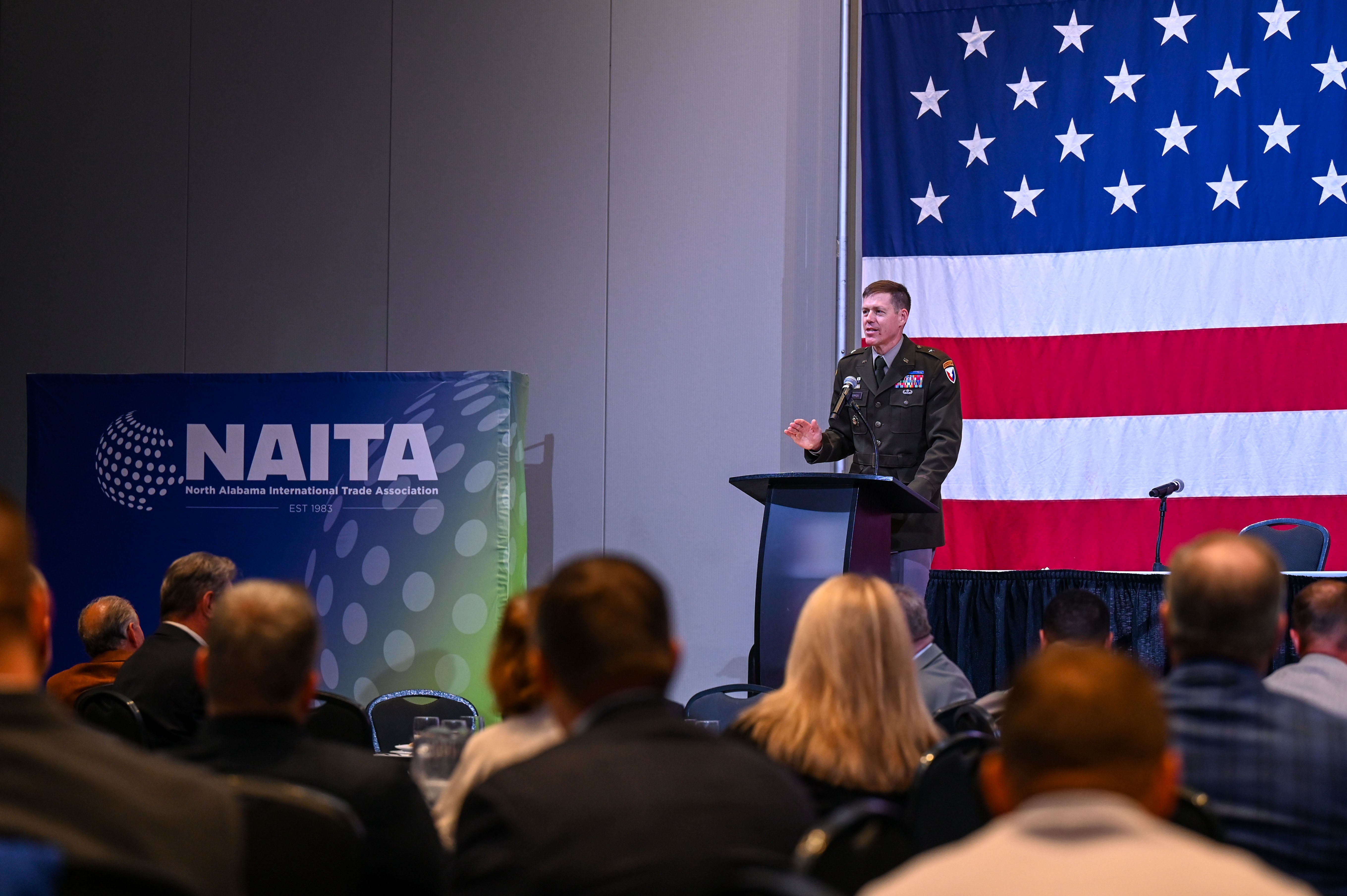 U.S. Army Brig. Gen. Allen J. Pepper, U.S. Army Security Assistance Command commanding general, provides the keynote address for the North Alabama International Trade Association's Foreign Military Sales Industry Day summit in Huntsville, Ala., Aug. 27, 2025. The theme for NAITA's Industry Day summit this year was "FMS: Supporting Our National Defense Strategy," and sought to provide insight into the current and future state of Seucrity Assistance and International Acquisition through Foreign Military Sales. (U.S. Army photo by Kristen Pittman)
