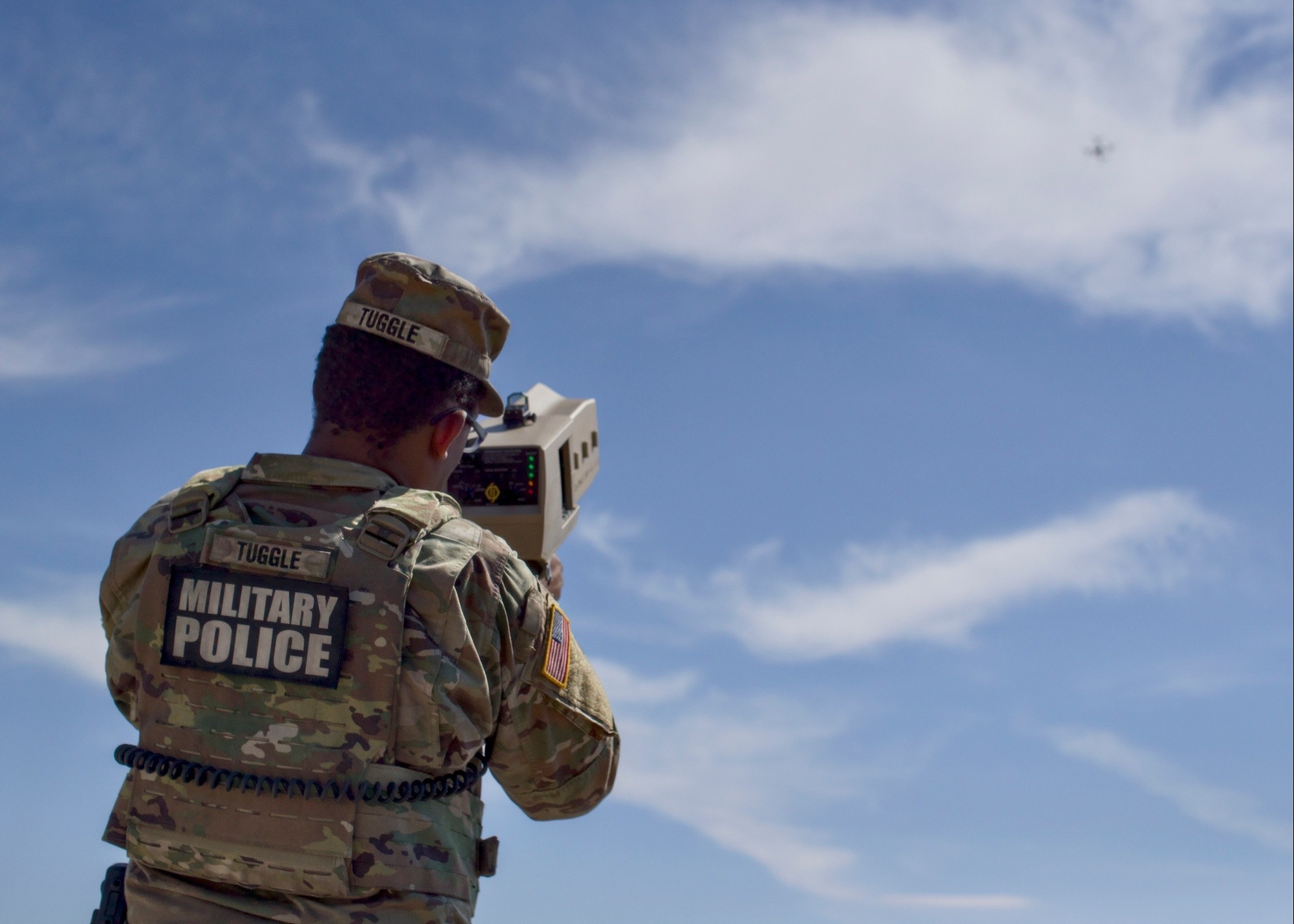 Using a counter-drone device, a Fort Bliss Law Enforcement Activity, Military Police Company Soldier participates in a counter-unmanned aircraft system drill as part of an integrated protection exercise at Fort Bliss, Texas, Aug. 20, 2025. The equipment is designed to jam the signal of a hostile drone, protecting personnel and facilities.