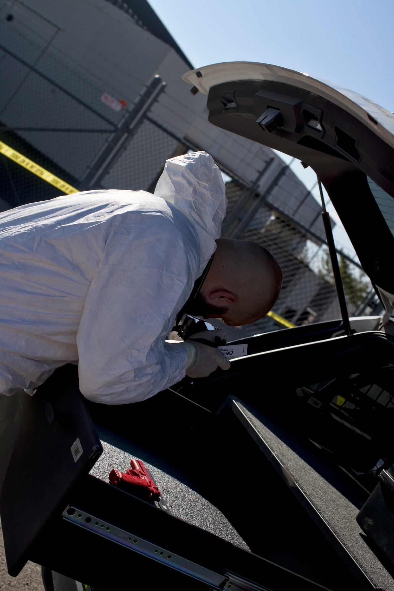 An Army Criminal Investigation Division special agent prepares his equipment at a simulated crime scene at Fort Bliss, Texas, Aug. 20, 2025. Meticulous preparation is a critical first step in the investigative process, ensuring all potential evidence can be properly documented. This training scenario was part of a post-wide integrated protection exercise.