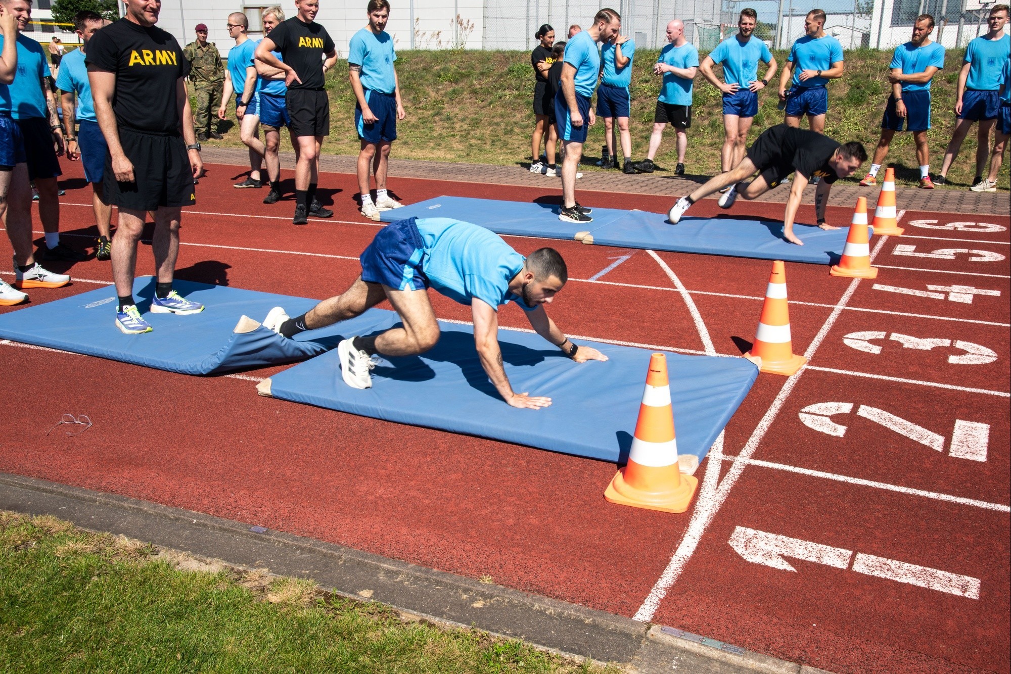 U.S. and German Soldiers participate in the physical fitness test as part of the German Armed Forces Military Proficiency Badge, Delitzsch, Germany, Aug 18, 2025. The 7th Army Noncommissioned Officer Academy regularly partners with the Bundeswehr NCOA and seeks to deepen the German-American military partnership to ensure training transformation efforts resonate at the point of need across the European theater and alongside our multinational partners. (U.S. Army photo by Sgt. Kammen Taylor)