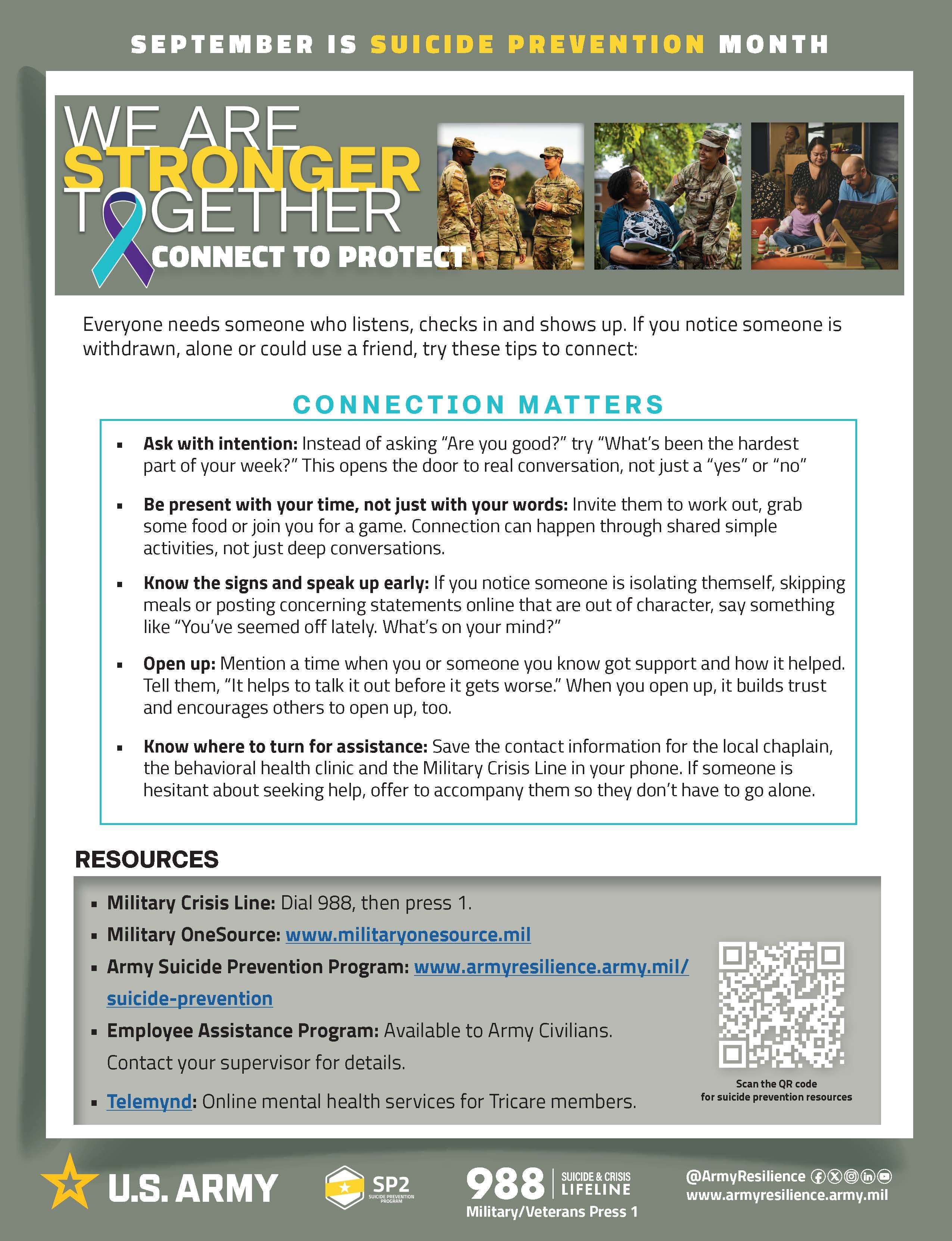ABERDEEN PROVING GROUND, Md. – September is Suicide Prevention Month, a time dedicated to building awareness of available resources for those who may need support and for those who want to help someone they know.