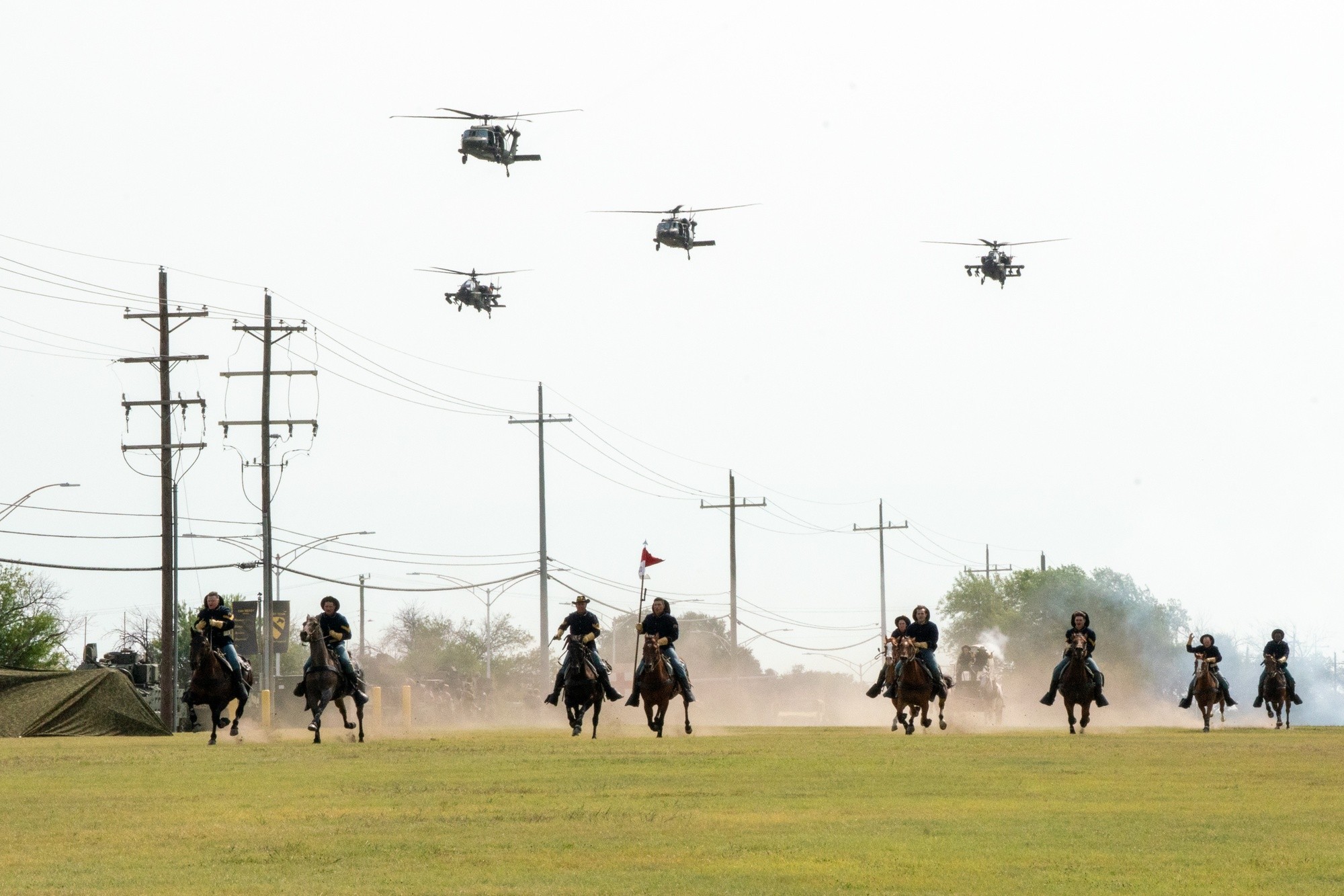 Aircraft from 1st Air Cavalry Brigade fly over the Horse Cavalry Division’s charge during the Cav Week 104 closing ceremony at Fort Hood, Texas, Sept. 3. The flyover honors the division’s history and supports the traditional cavalry charge. (U.S. Army photo by Spc. Hector Blanco)