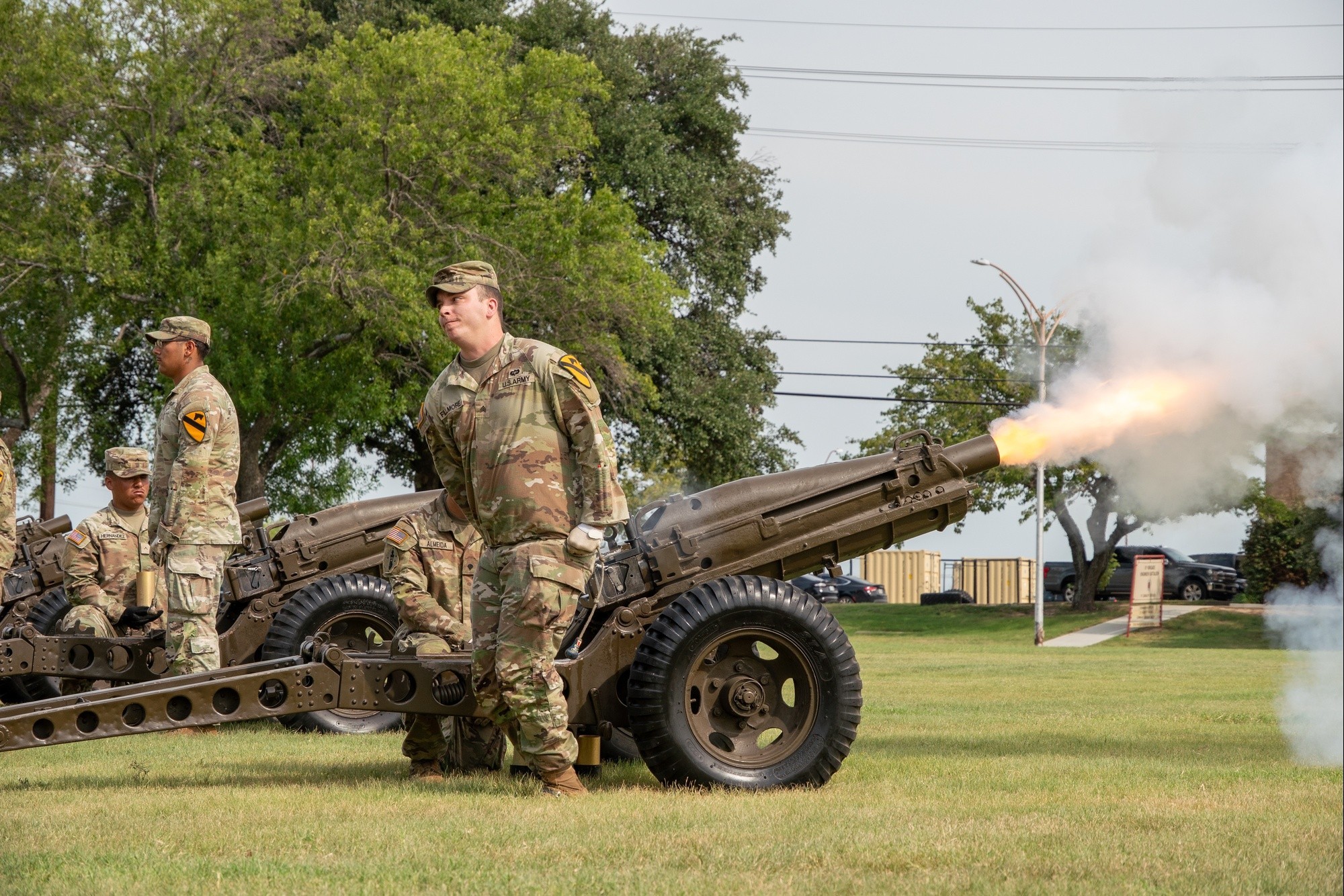 Troopers of the 1st Cavalry Division fire a cannon during a division run at Fort Hood, Texas, Sept. 3, 2025, as part of Cav Week 104. The weeklong celebration marks the division’s 104th birthday with events designed to build morale and esprit de corps. (U.S. Army photo by Spc. Julian Winston)