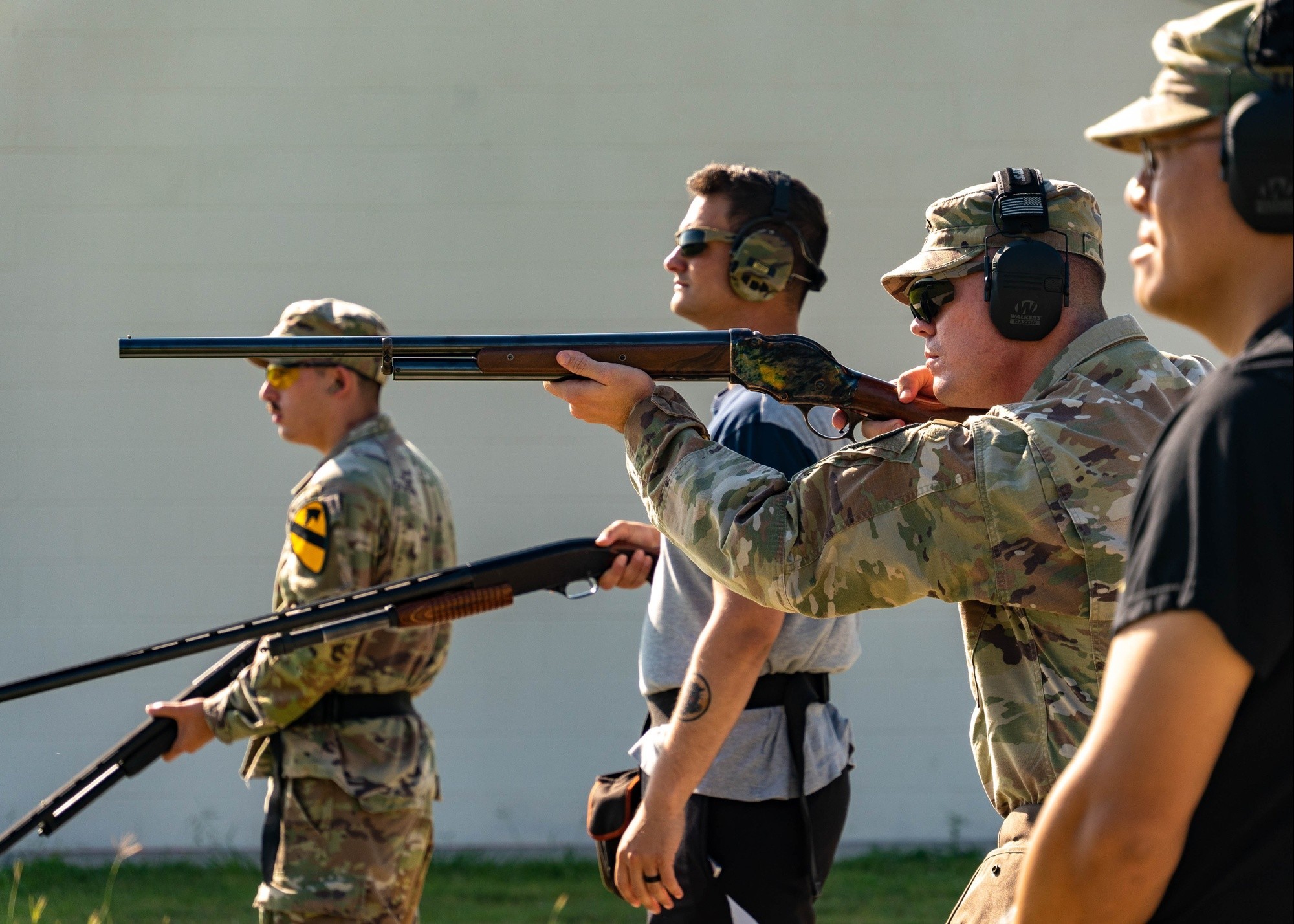 Troopers, assigned to the 1st Cavalry Division, participate in a skeet shooting competition during the Cav Week 104 five-stand skeet shoot at the Fort Hood Skeet and Trap Club, Fort Hood, Texas, September 3, 2025. Fort Hood U.S. Army Morale, Welfare and Recreation hosted the event for 1st Cavalry Division Troopers to exhibit their shooting skills as part of the week-long Cav Week 104 celebration. (U.S. Army photo by Spc. Hector Blanco)