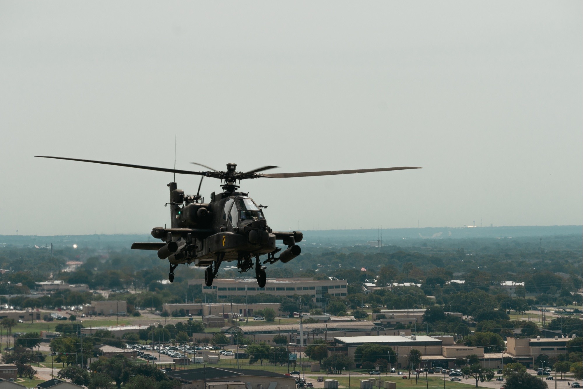 AH-64E Apaches Palehorse 05 and Crazyhorse 23 fly in formation over the 1st Cavalry Division’s annual division run at Fort Hood, Texas, Sept. 3, 2025. The run commemorates 104 years of service and tradition for the “First Team.” (U.S. Army photo by 1st Lt. Tyler Williams)