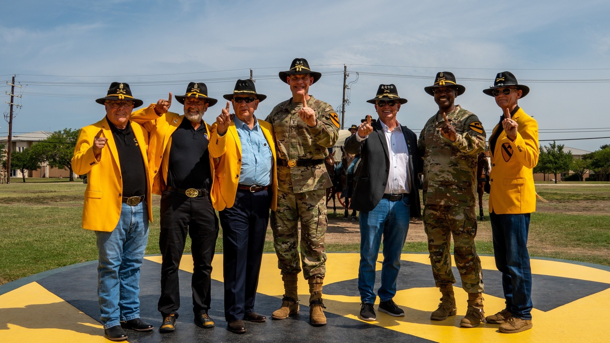 Hall of Legends members take a group photo with the 1st Cavalry Division command team to celebrate Lt. Gen. (ret.) Paul E. Funk's induction into the Hall of Legends during the division's 104th birthday ceremony on Fort Hood, Texas, Sep. 5, 2025. The week long celebration marked the division’s 104th birthday with events designed to build morale and esprit de corps. (U.S. Army photo by Spc. Julian Winston)