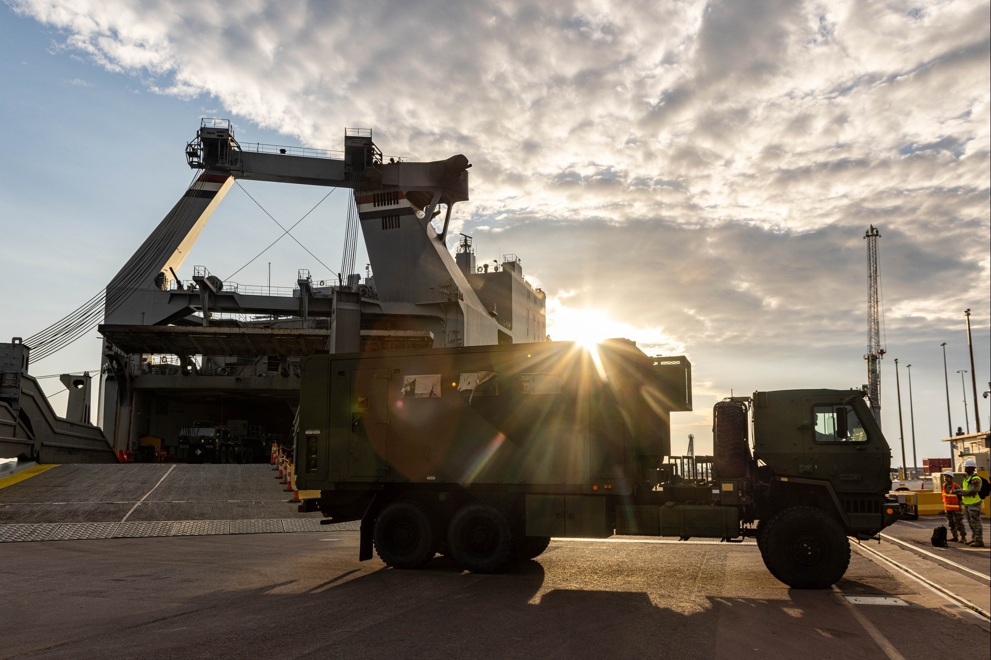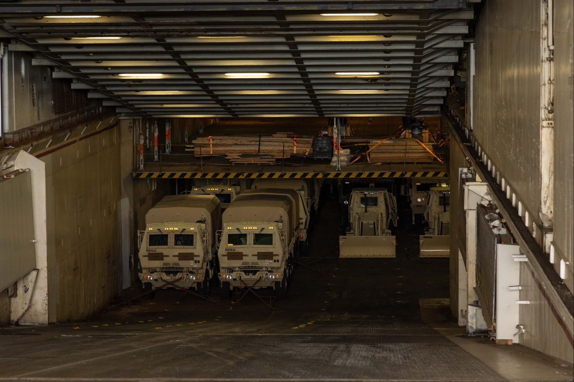 U.S. Army vehicles offload from the Military Sealift Command-chartered Motor Vessel Cape Henry in preparation for exercise Talisman Sabre 25 at Port Darwin, Australia, June 9, 2025. Talisman Sabre is the largest bilateral military exercise between Australia and the United States, with multinational participation, advancing a free and open Indo-Pacific by strengthening relationships and interoperability among key allies and enhancing our collective capabilities to respond to a wide array of potential security concerns. (U.S. Army photo by Sgt. Devin Davis)