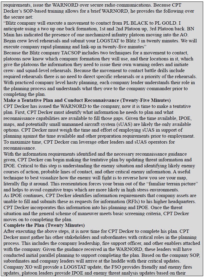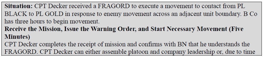 In this example, we will focus on the actions of CPT Decker, Commander of B Company “Blitz”, a Mechanized Infantry Company. CPT Decker and Blitz company have three hours until SP, thus CPT Decker has one hour to complete his plan.