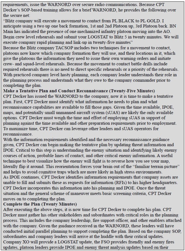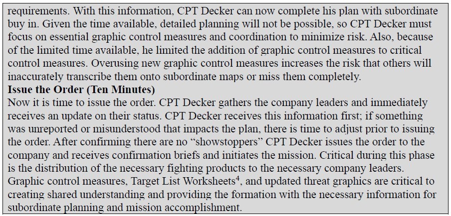 The Army provides leaders at all levels training in deliberate planning during their professional military education (PME) courses. However, rarely do these courses train Lieutenants and noncommissioned officers (NCOs) on how to plan under significant time constraints. Short planning periods during institutional training – between four and eight hours – do not replicate the stresses of planning in one to two hours in response to a higher headquarters fragmentary order (FRAGORD) while sleep deprived and lacking a complete understanding of the enemy situation. This paper provides an approach to the troop leading procedures (TLP) process, both before and during execution, that can guide leaders through a rapid planning process. It is not a replacement for the TLP process, but an approach to its application.