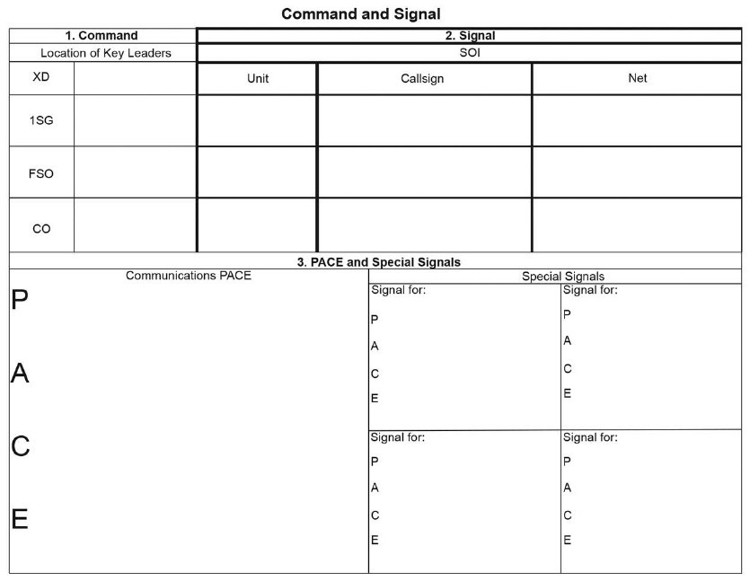 Effective SOPs are critical. To plan quickly, units must thoroughly understand and train on their SOPs. Company and platoon SOPs must include the information necessary to enable subordinate leaders to support the rapid planning process while leaders engage in planning tasks. SOPs must include the following: