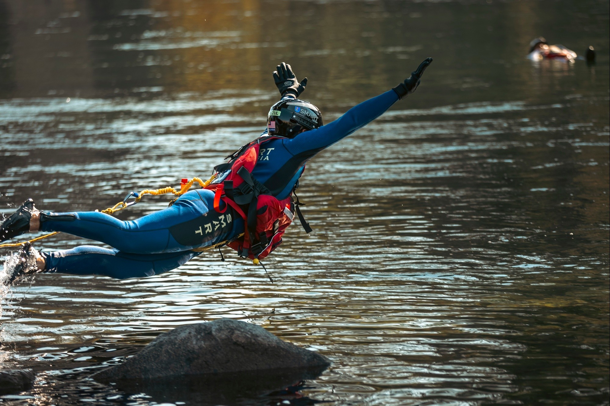 A member of the Special Malaysia Disaster Assistance and Rescue Team (SMART) makes a swift water entry dive during water rescue training level one in Spokane, Wash., Sept. 28, 2025. The Washington National Guard, along with the Spokane County Sheriff’s Department, hosted the Malaysian SMART search and rescue unit for a week-long domestic response workshop. The workshop was coordinated through the State Partnership Program and was the first civilian-to-civilian engagement held in Washington state.