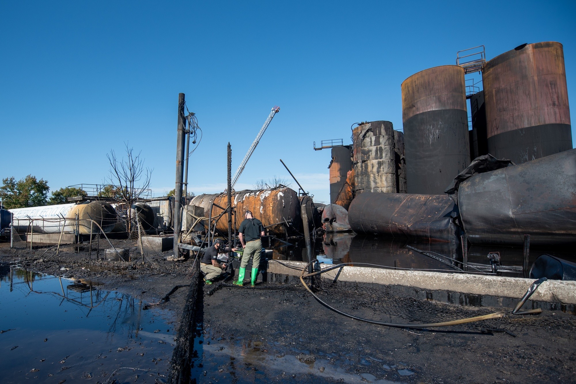Meanwhile, another Guard firefighter deployed his own blanket of foam from the Air Force crash truck, and a third Guard effort directed a master stream of water to protect storage tanks filled with oil at the recycling facility, where at least two tanks had already exploded from the heat.