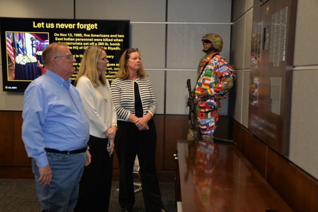 Former members of USASAC in the Huntsville, AL area held a memorial ceremony on Nov 13, marking the 30th anniversary of the bombing in Saudi Arabia at our OPM-SANG site in 1995. The daughters of James Allen attended the ceremony; he was one of the five Americans killed that day. The lobby of USASAC HQ displays a large plaque with the names of the five fallen colleagues along with a Purple Heart medal. In the photo is LTC (R) Larry Allen (former employee at OPM-SANG in 1995), Jody Wehner, and Jamie Faulkner look at the plaque in the lobby which includes their father's name.