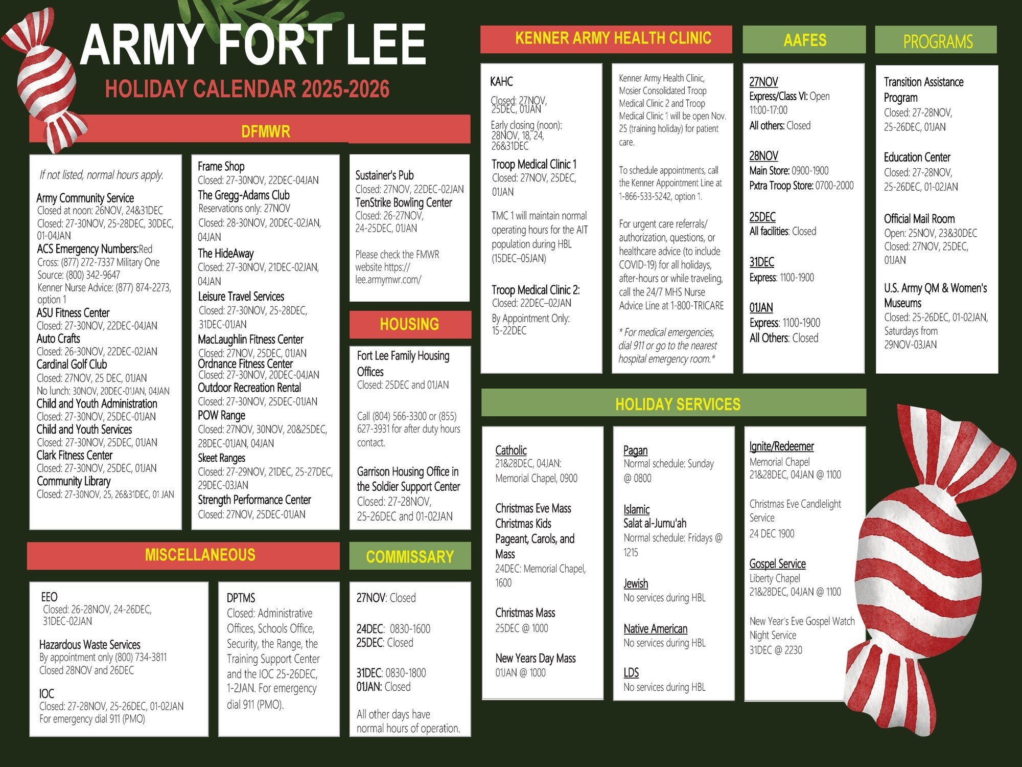 FORT LEE, Va. — Many Fort Lee organizations and offices will change their hours of operation and/or close on certain days during the holidays, including Thanksgiving break Nov. 27-30 and Holiday Block Leave Dec. 17-Jan. 5.