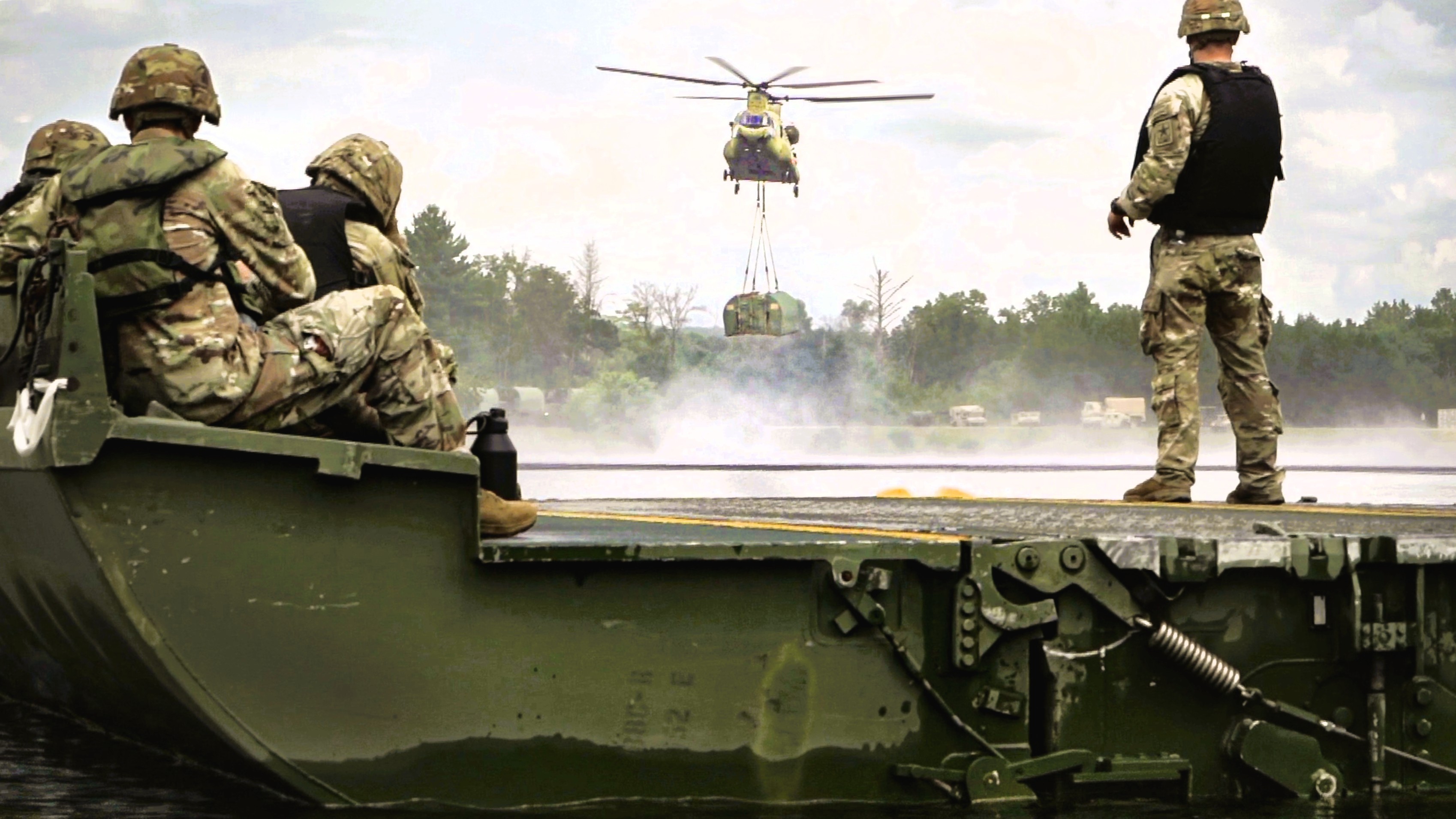 U.S. Army Reserve Soldiers with the 363rd Engineer Battalion conduct bridging operations by connecting bay pieces delivered by a CH-47 Chinook at Global Strike 2025 during the Combat Support Training Exercise (CSTX) at Fort McCoy, Wisconsin, Aug. 7. The CSTX prepares Army Reserve units for deployment by providing realistic, externally evaluated, and collective training scenarios. (U.S. Army Reserve photo by Staff Sgt. Philip Ribas)