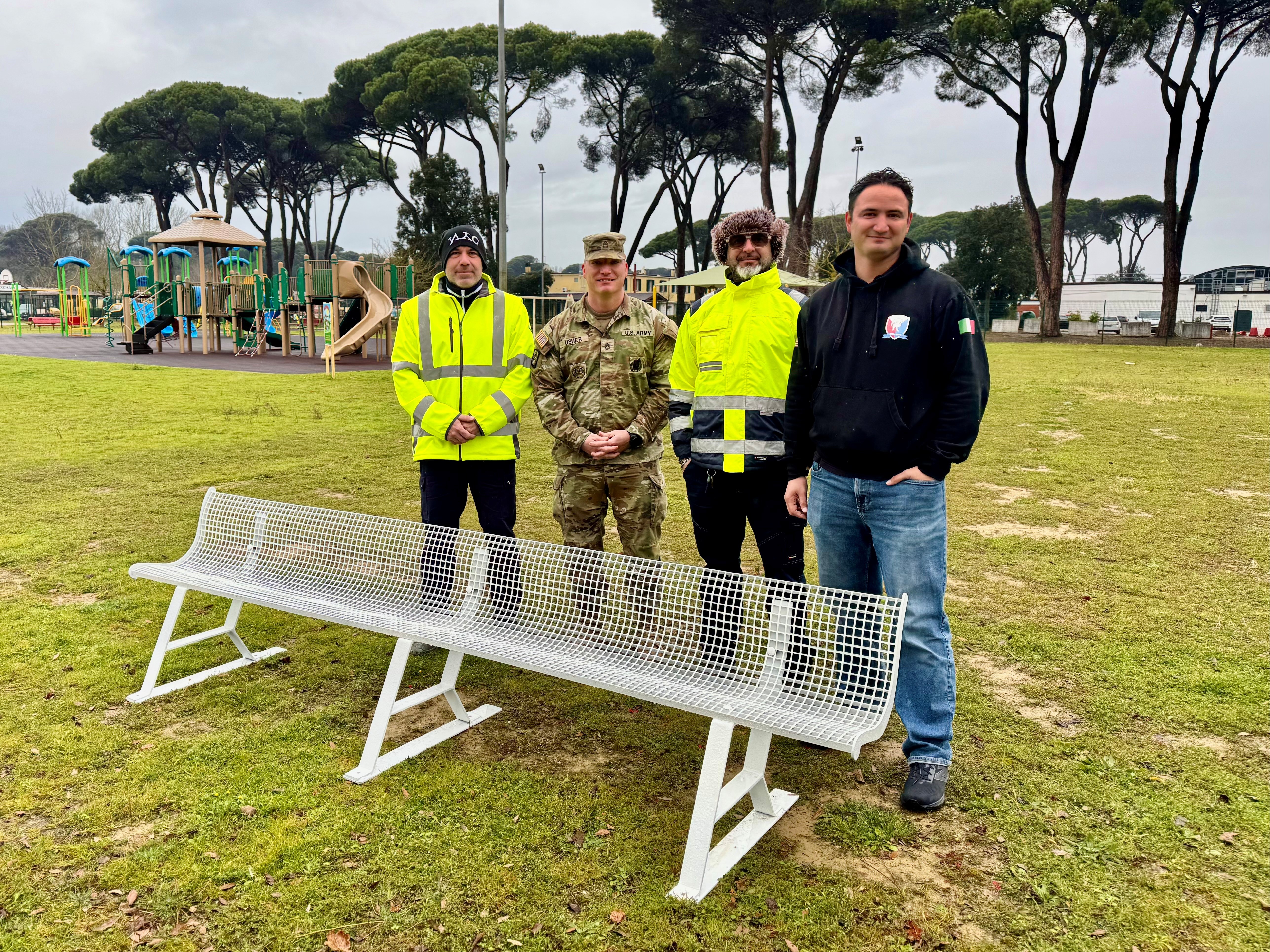 Sgt. First Class Daniel Chiu and Sgt. First Class Patrick Usher of the 405th AFSBN handed the bolted benches to the school after they had been disassembled, cleaned, modified to improve safety, and repainted by team members Massimiliano Lami and Alessio Maenza.