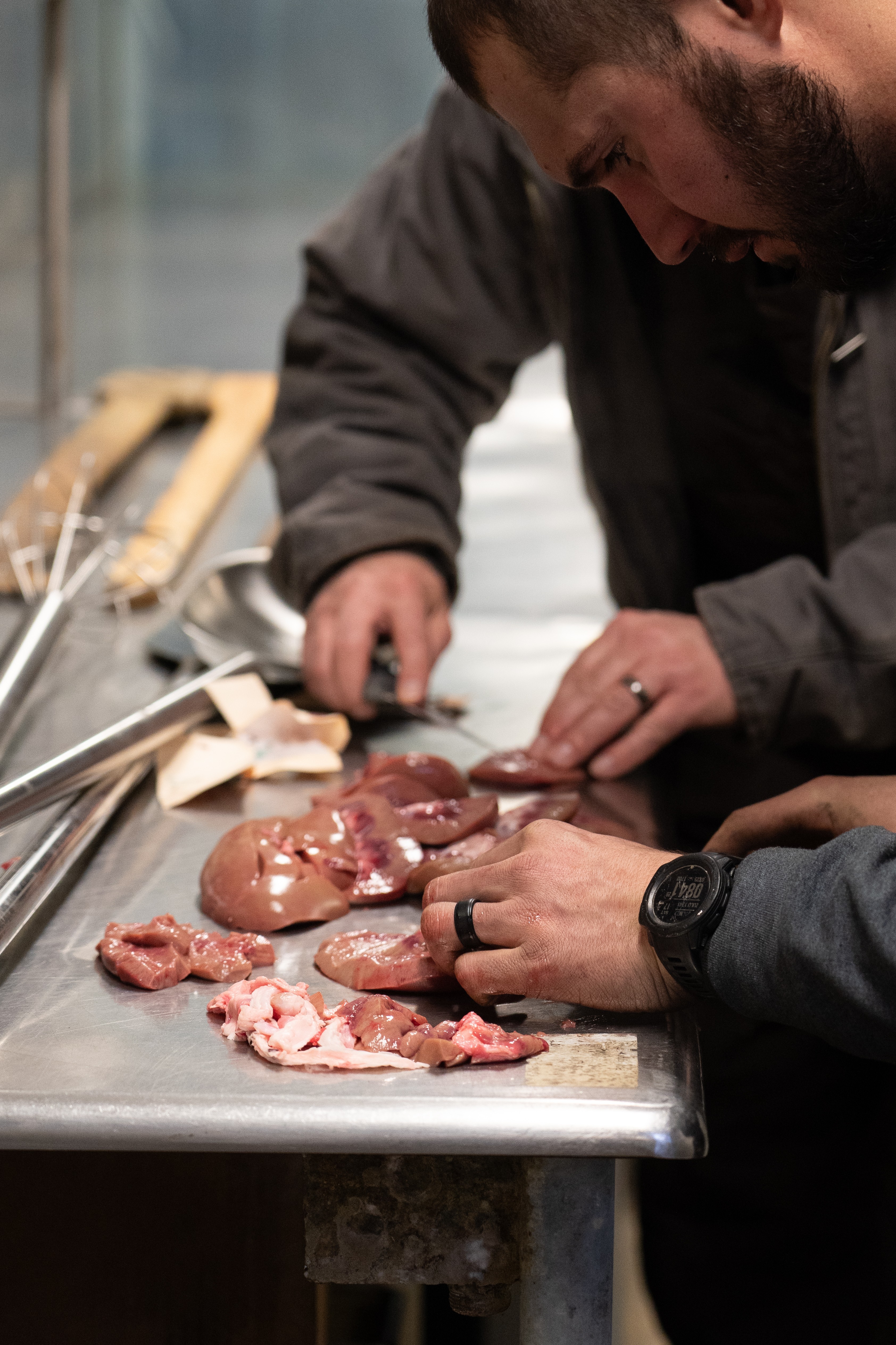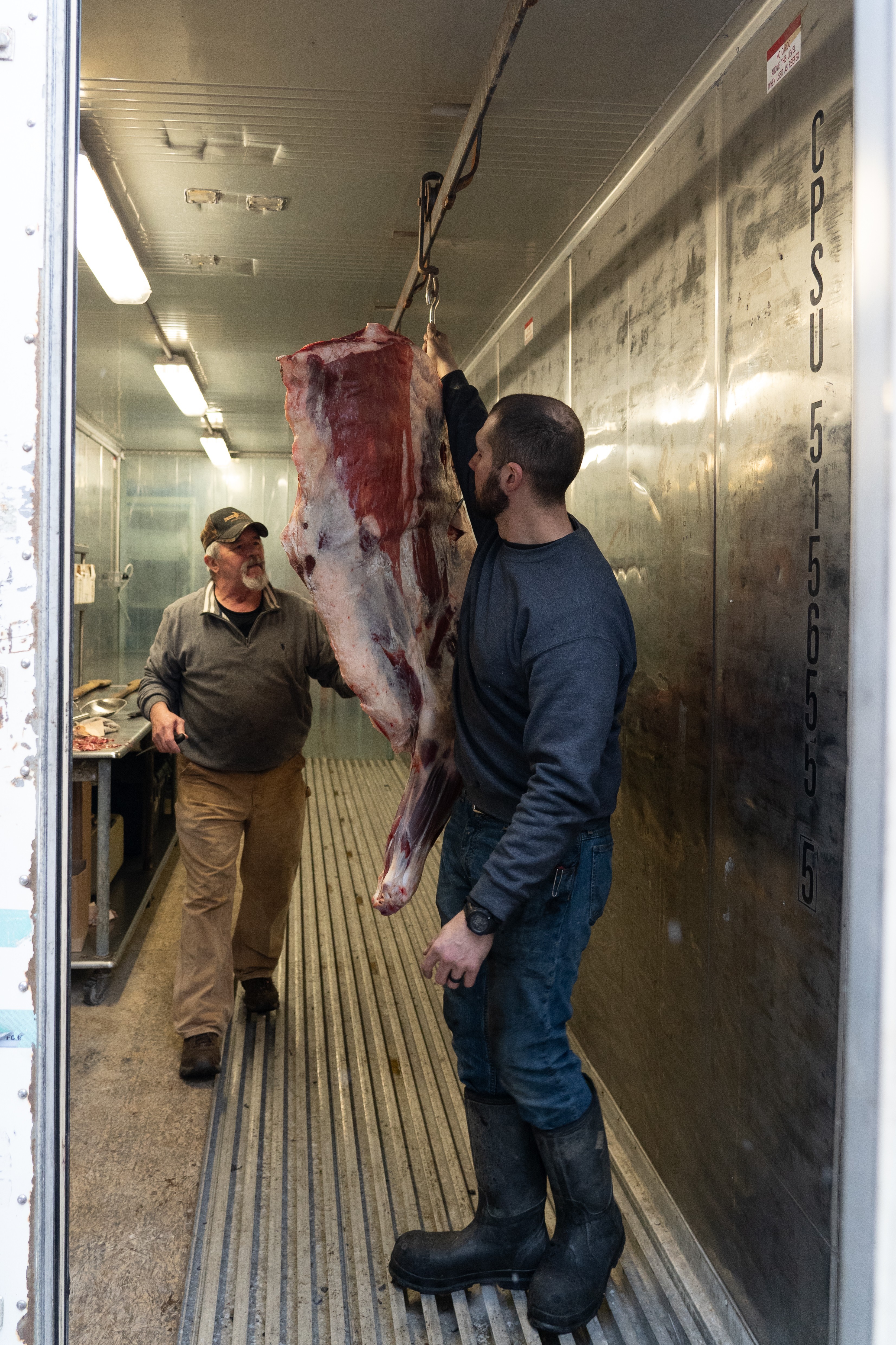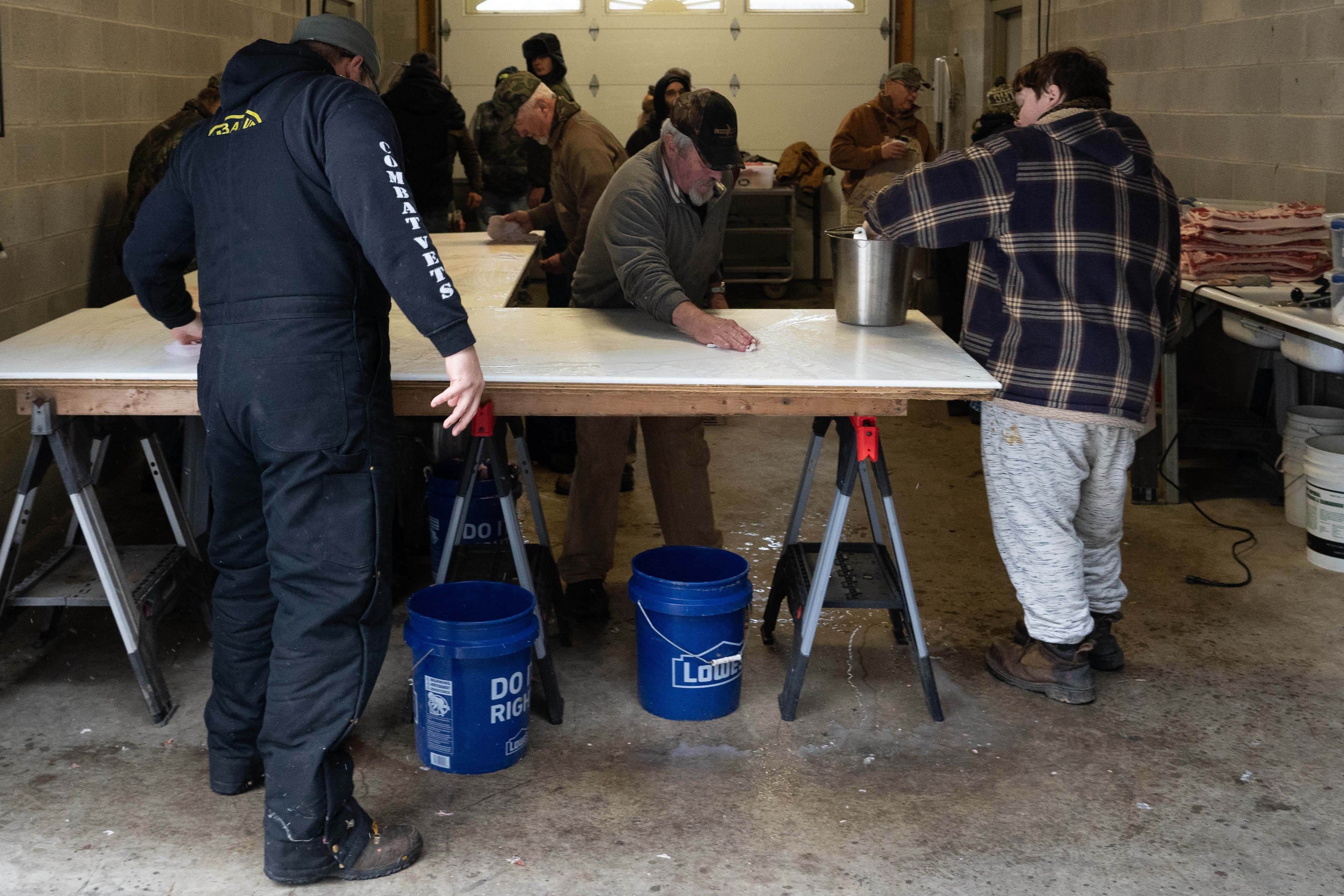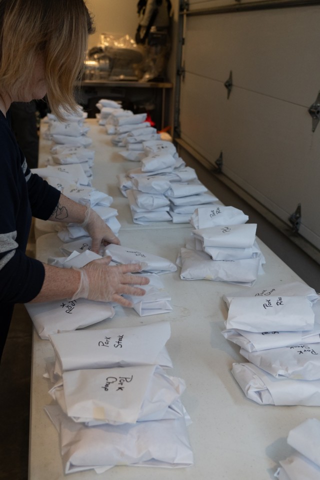 The January butchering event exemplifies this volunteer spirit. Koch continues a family tradition that his grandfather and father practiced on their farms, bringing together approximately 80 veterans and volunteers for a traditional butchering of one steer and three hogs. Volunteers work alongside veterans throughout the day as they cut, grind, and package the meat. At the end of the event, participants take home their share, and the shared work reinforces the bonds that define the partnership.