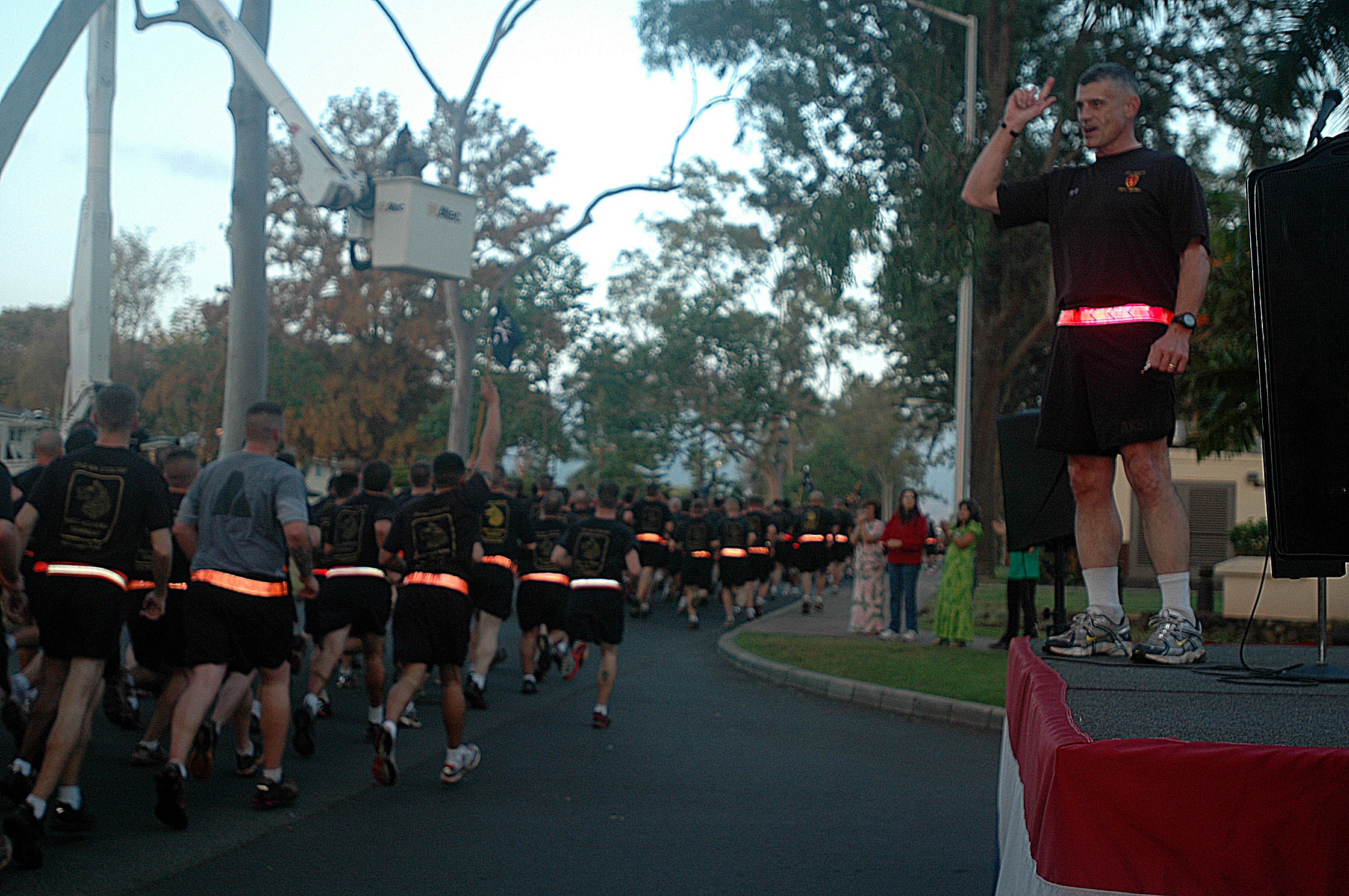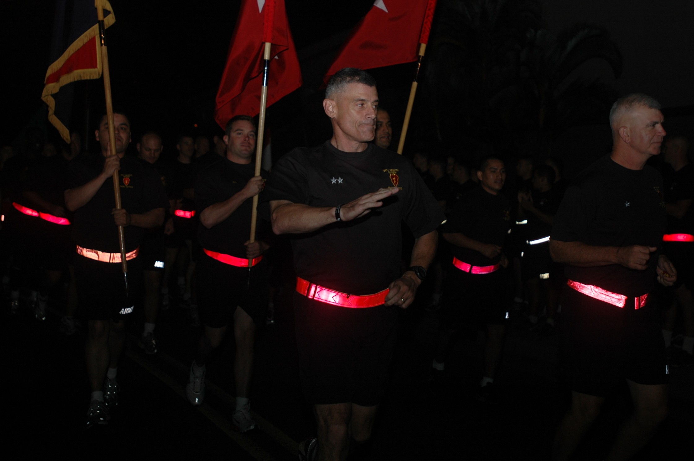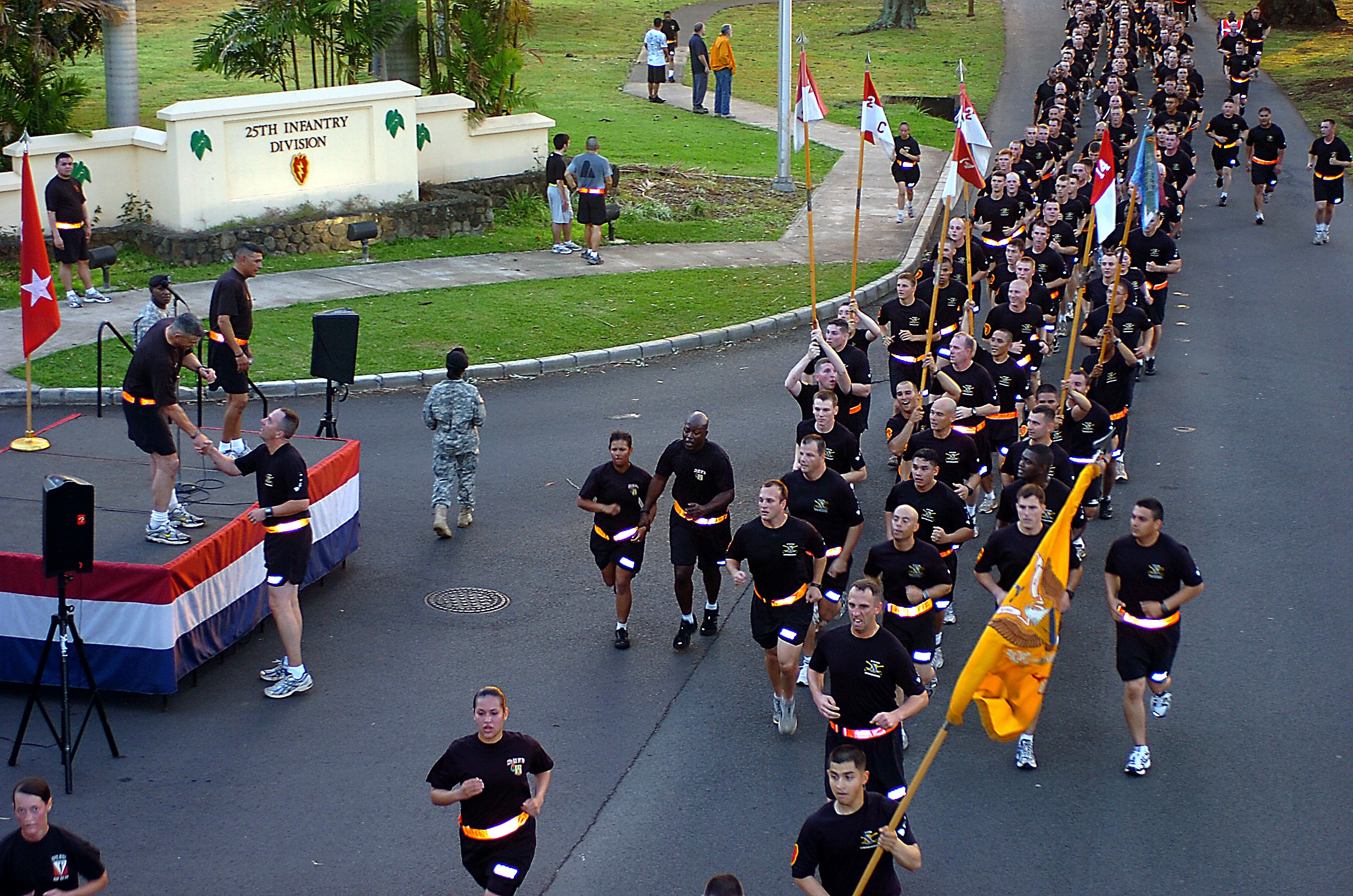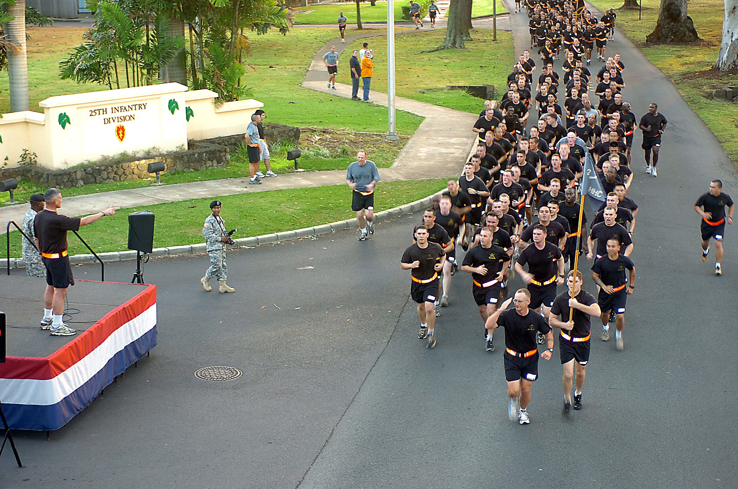 The run began immediately following the reveille with the division's command staff leading the 25th STB on a circular route, with the 2nd SBCT and 3rd SBCT joining in the formation along the way.