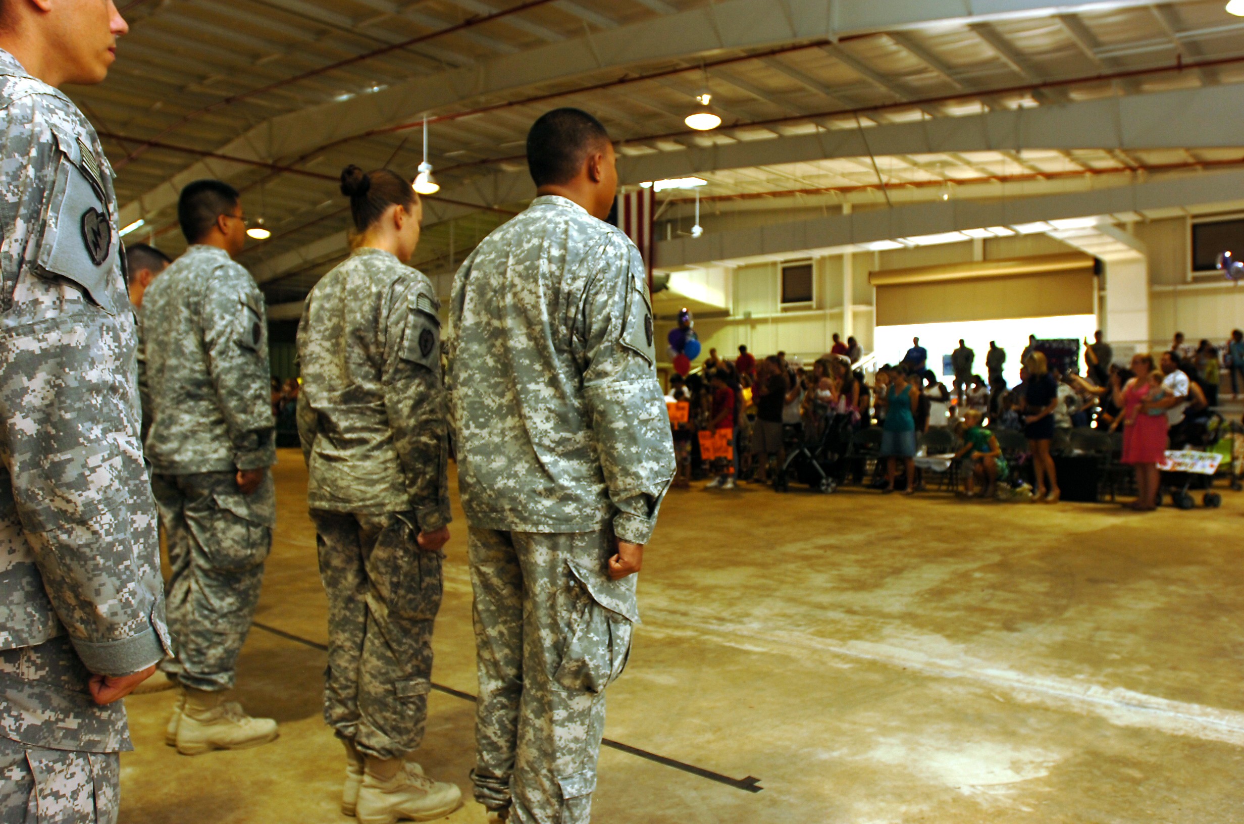 A formation of 25th Combat Aviation Brigade Soldiers stand before an audience of their families, friends and loved ones during the Welcome Home Ceremony held at Wheeler Army Airfield, Hawaii, July 12, in honor of the Soldiers of the 25th Combat Aviat...