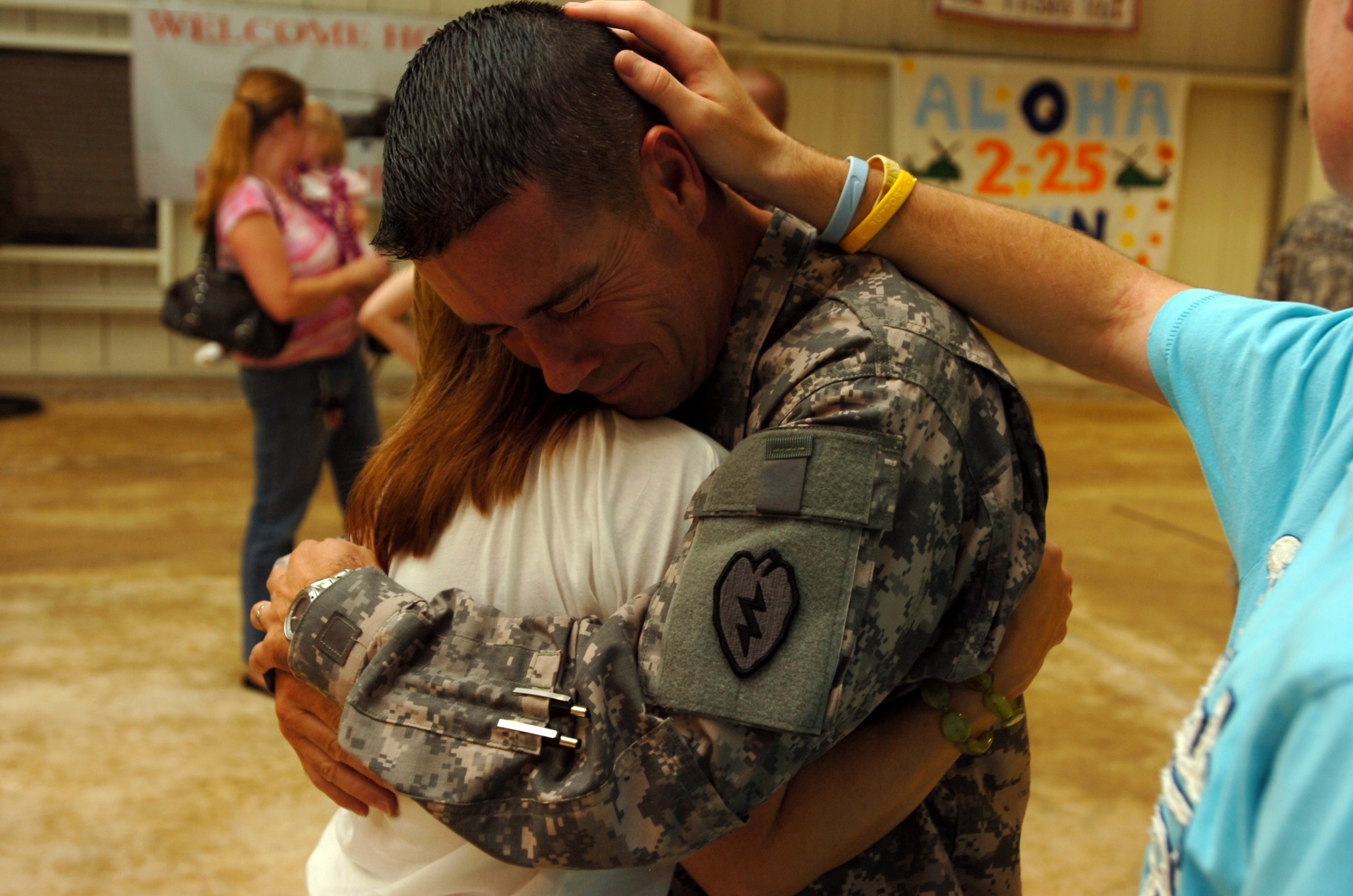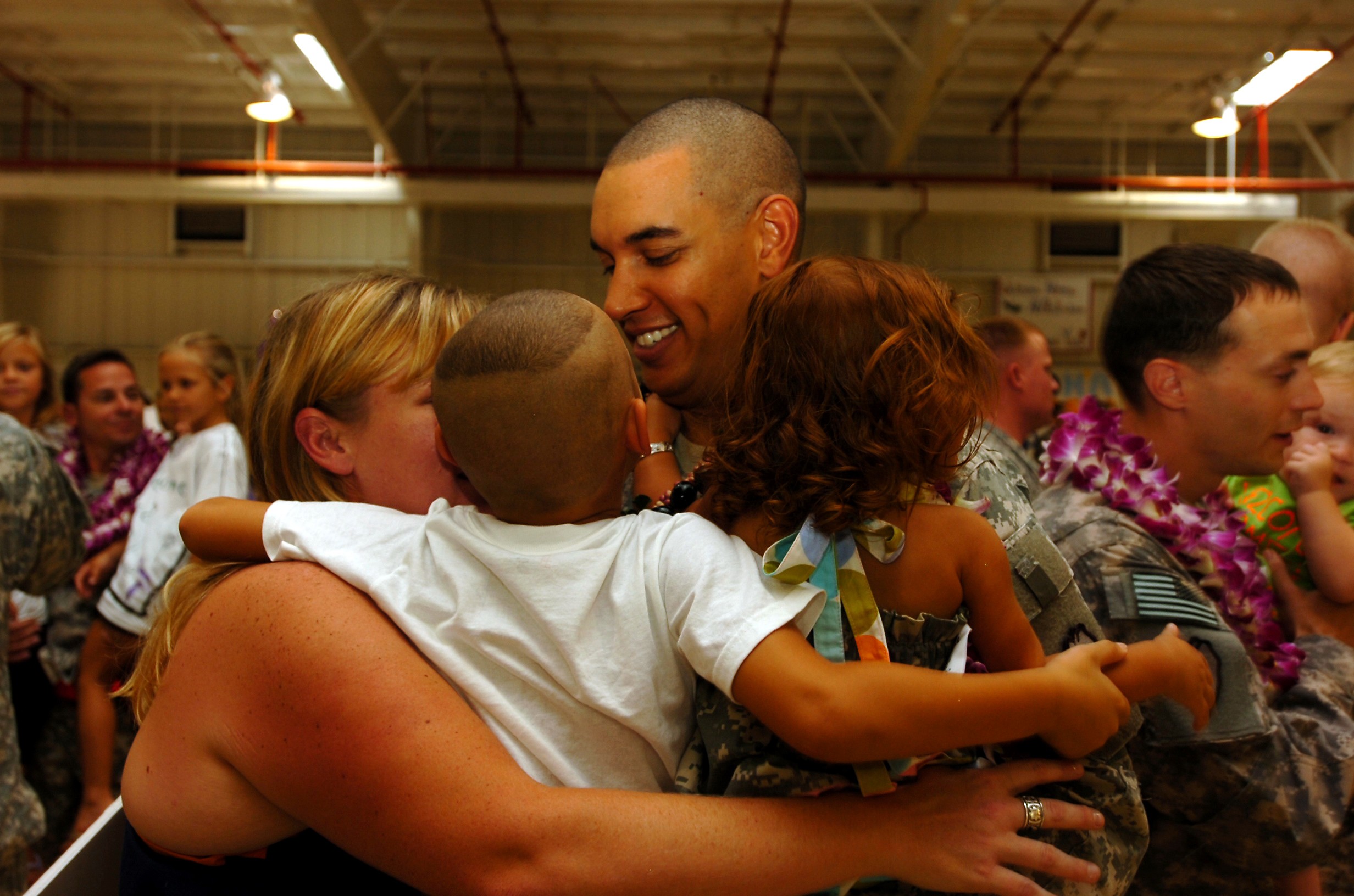 A 25th Combat Aviation Brigade Soldier is lovingly encircled by his family during the Welcome Home Ceremony held at Wheeler Army Airfield, Hawaii, July 12, in honor of the Soldiers of the 25th Combat Aviation Brigade's successful 12-month rotation t...