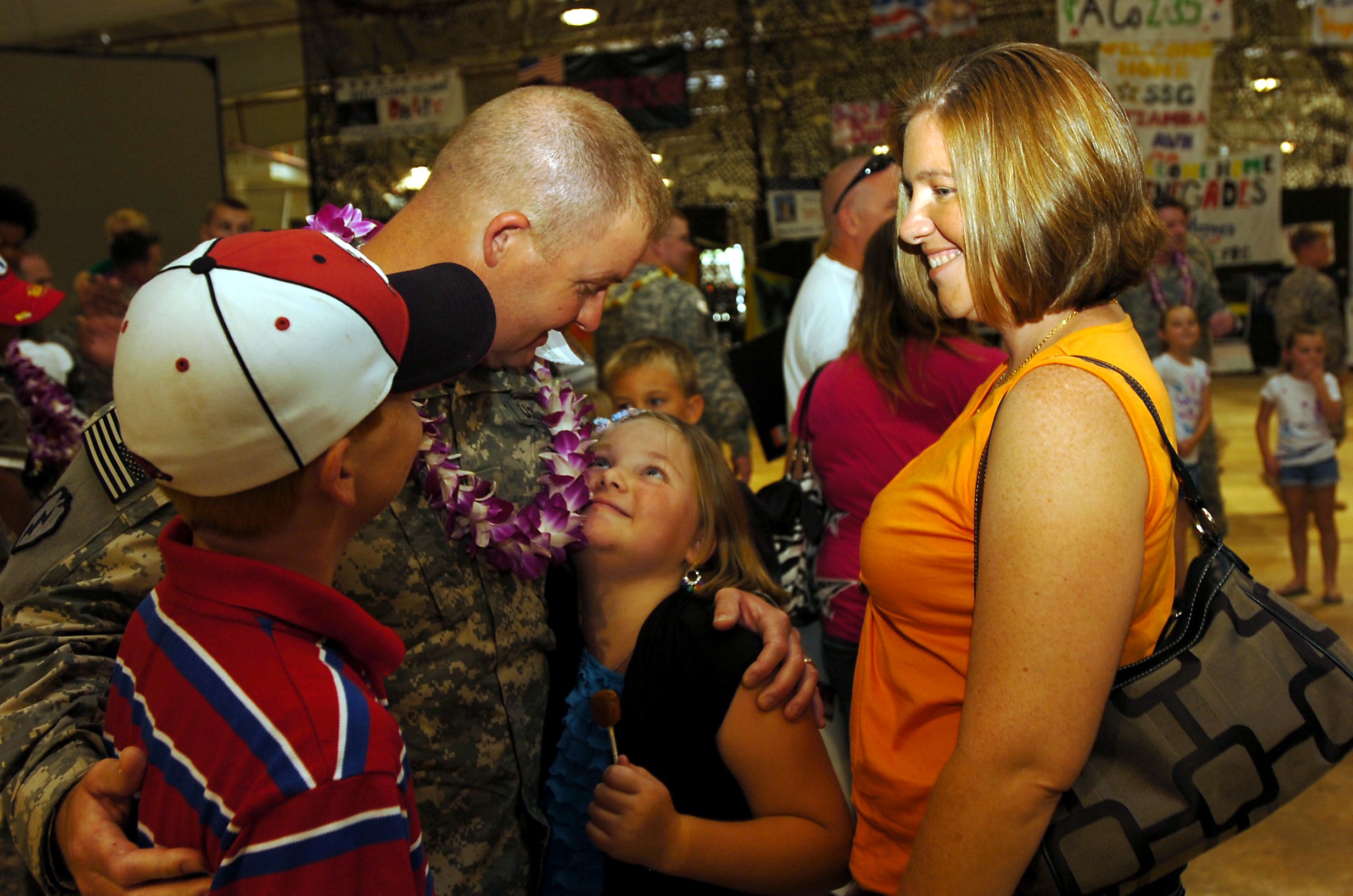 A 25th Combat Aviation Brigade Soldier playfully chats with his daughter during the Welcome Home Ceremony held at Wheeler Army Airfield, Hawaii, July 12, in honor of the Soldiers of the 25th Combat Aviation Brigade's successful 12-month rotation to ...