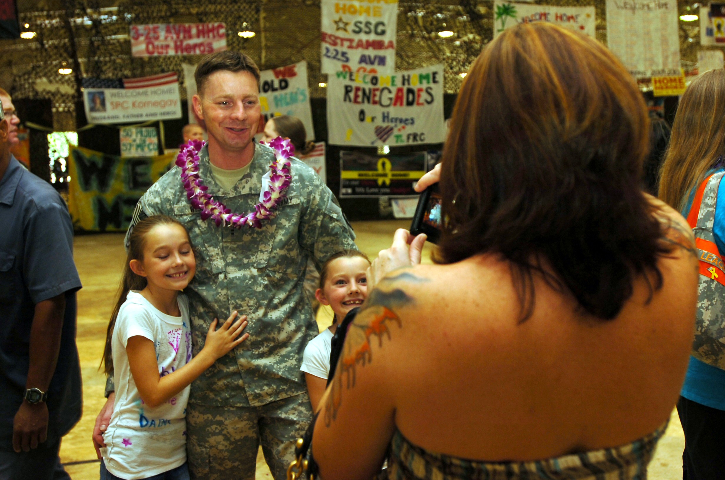 A warrant officer with the 25th Combat Aviation Brigade poses for a family photo for his wife during the Welcome Home Ceremony held at Wheeler Army Airfield, Hawaii, July 12, in honor of the Soldiers of the 25th Combat Aviation Brigade's successful 1...
