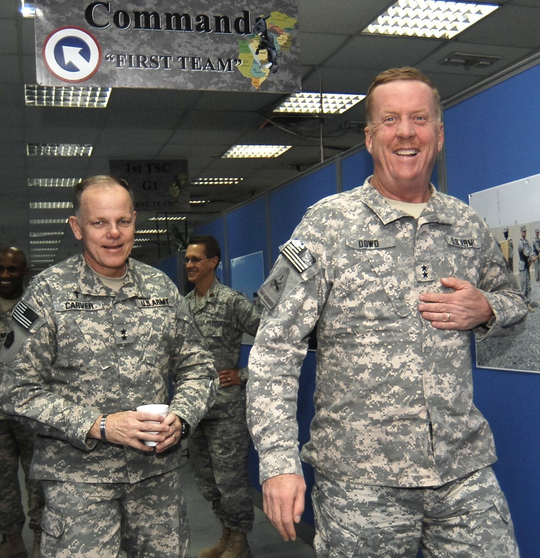 CAMP ARIFJAN, Kuwait - Chief of Chaplains of the Army, Chaplain (Maj. Gen.) Douglas L. Carver (left), of Rome, Ga., visits Maj. Gen. Kenneth Dowd (right), commanding general of 1st Theater Sustainment Command, during a tour of Camp Arifjan Nov. 27. C...