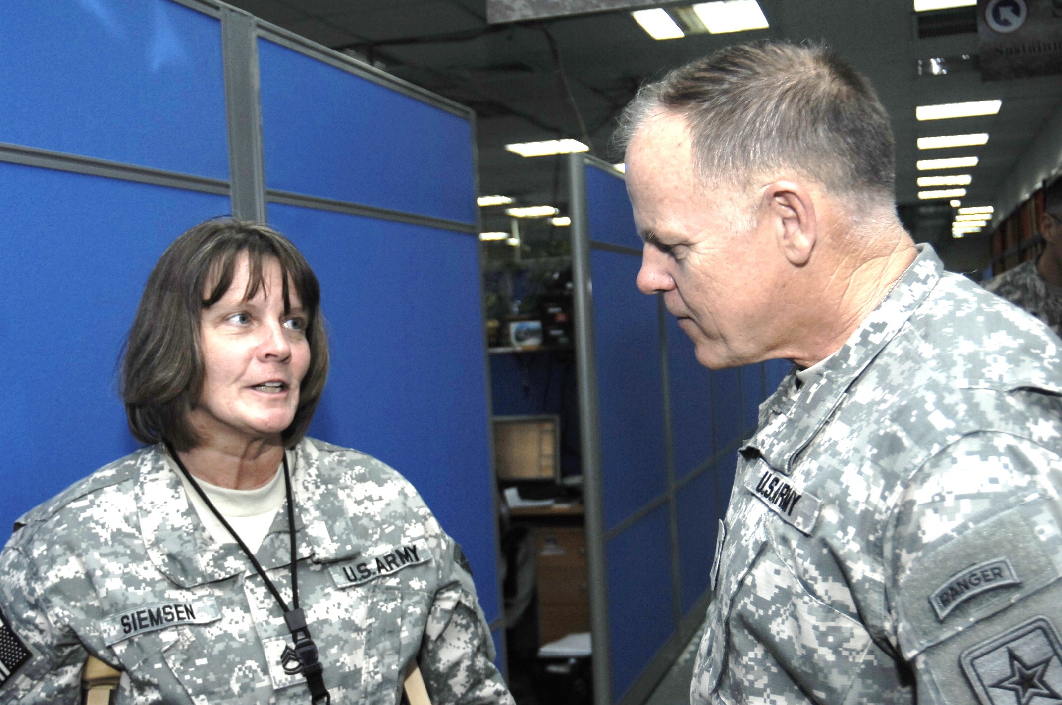 CAMP ARIFJAN, Kuwait - Chief of Chaplains of the Army, Chaplain (Maj. Gen.) Douglas L. Carver (right), of Rome, Ga., speaks with Sgt. 1st Class Pamela Siemsen, 1st Theater Sustainment Command (left), during a tour of Camp Arifjan Nov. 27. Chaplain (M...