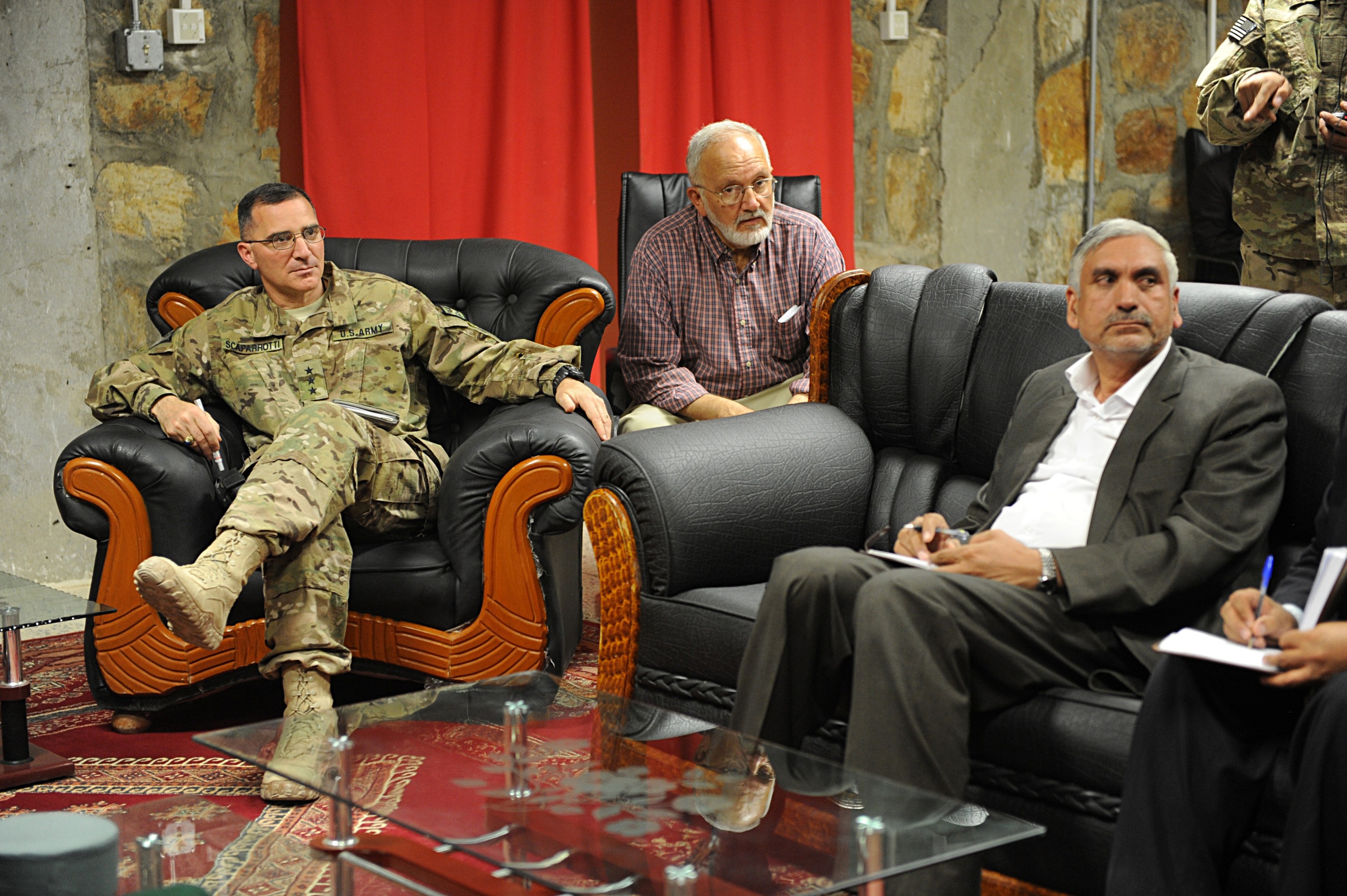 Lt. Gen. Curtis M. Scaparrotti, Commanding General for ISAF Joint Command, works through an interpreter to talk with Afghan leaders during a visit Aug. 2, near Kandahar, Afghanistan. Scaparrotti spent the day meeting with ISAF and Afghan leaders. L...