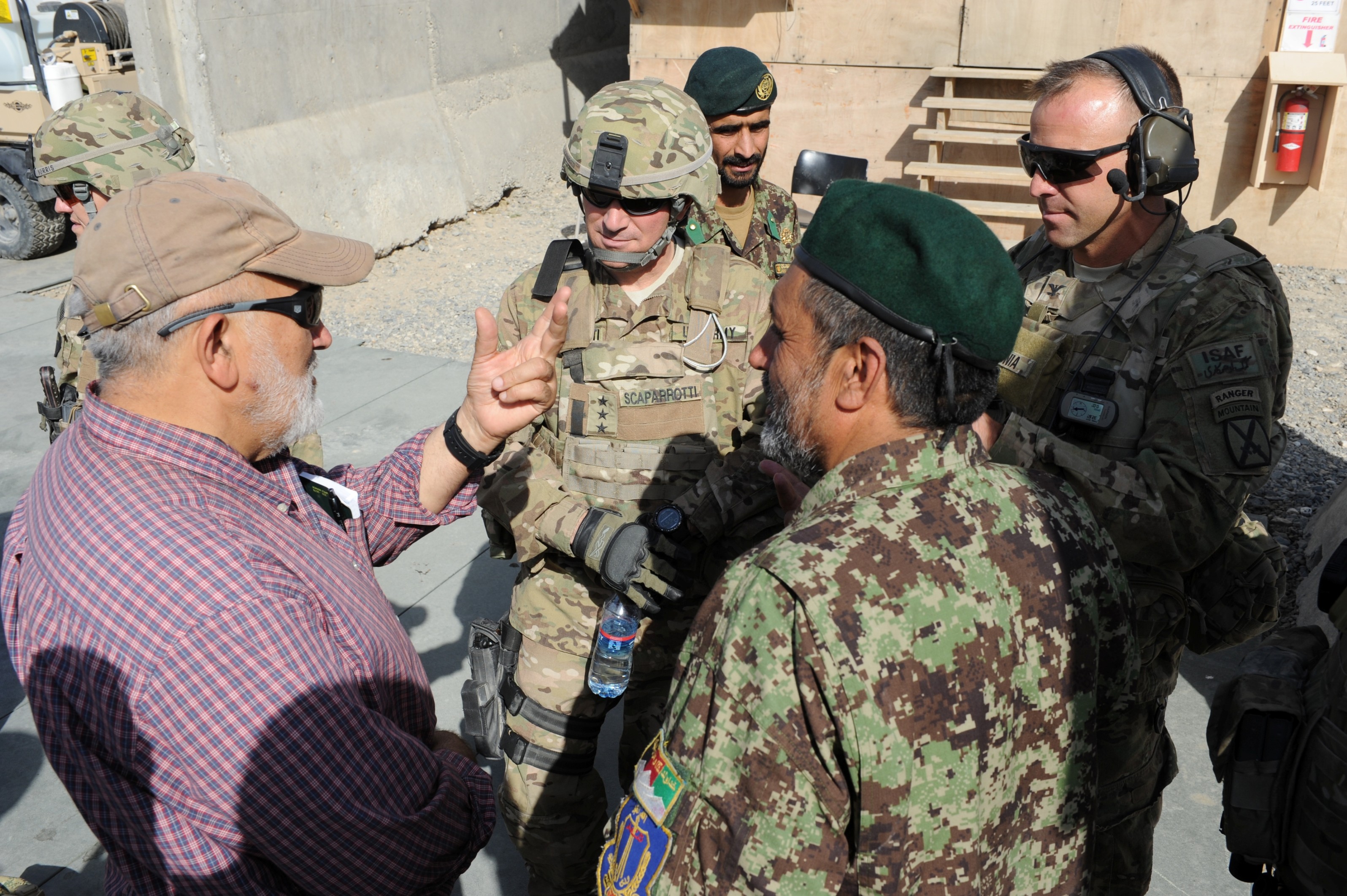 Lt. Gen. Curtis M. Scaparrotti, Commanding General for ISAF Joint Command, meets with Afghan leaders and ISAF Soldiers near Kandahar, Afghanistan. Scaparrotti talks with the combined team Aug. 2, about how Afghan and ISAF troops are holding, and exp...