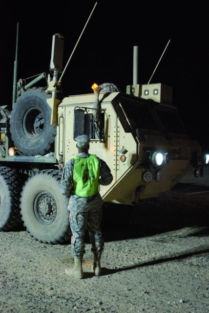 Utilizing their Blue Force Trackers to track the 1-8th's movement prior to arrival at Khabari Crossing, the two MCTs were ready to accept the convoys as they approached the border. The 265th MCT immediately helped the battalion adjust their weapons posture upon entering Kuwait. Reorganizing the weapons and ammunition situation is a vital step in maintaining the harmonious relationship U.S. armed forces currently have with the Kuwaiti government. "As the convoy crosses the border, two of our Soldiers meet the convoy at the midway yard to help separate the gun-trucks from the rest of the convoy's trucks," explained Staff Sgt. Angel Rosario, 265th's night shift noncommissioned officer-in-charge, on how the 265th reorganizes the incoming convoy.