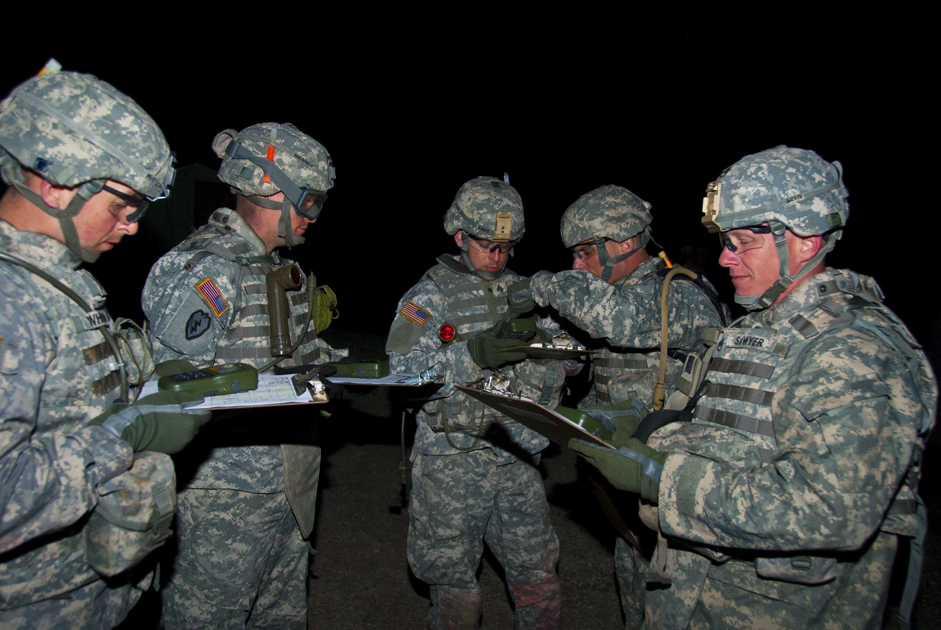 Soldiers prepare for Night Land Navigation during the First Army Division East Noncommissioned Officer and Soldier of the Year Competition, held at Camp Atterbury Joint Maneuver Training Center, Ind. From Left to right: Sgt. 1st Class Bo Whitson, Sp...