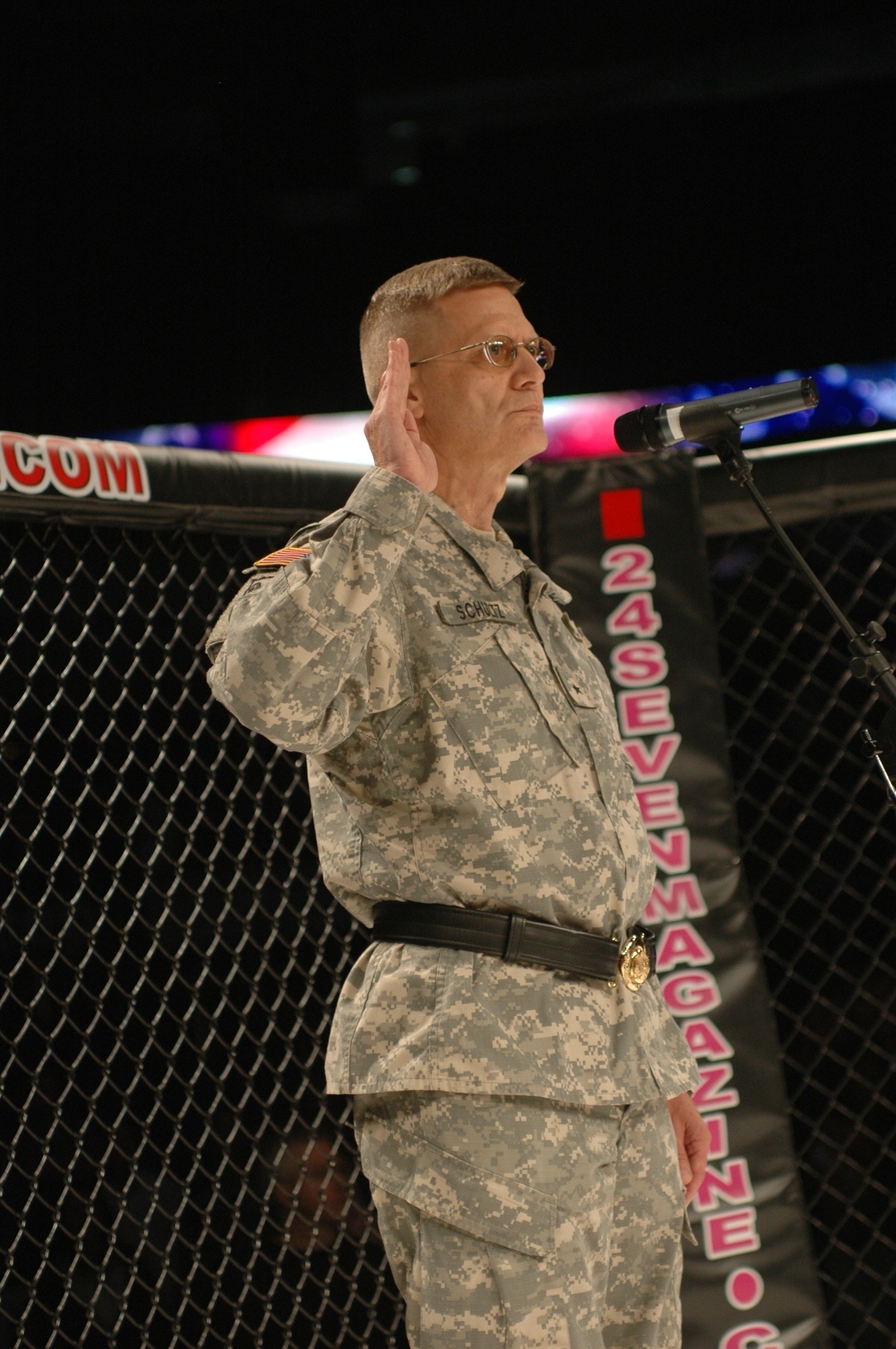During the opening ceremony of the fights, Brig. Gen. Daniel I. Schultz, commander of the 143rd Sustainment Command (Expeditionary) from Orlando, Fla., entered the ring, faced the formation and gave the oath of enlistment to the future Soldiers.
