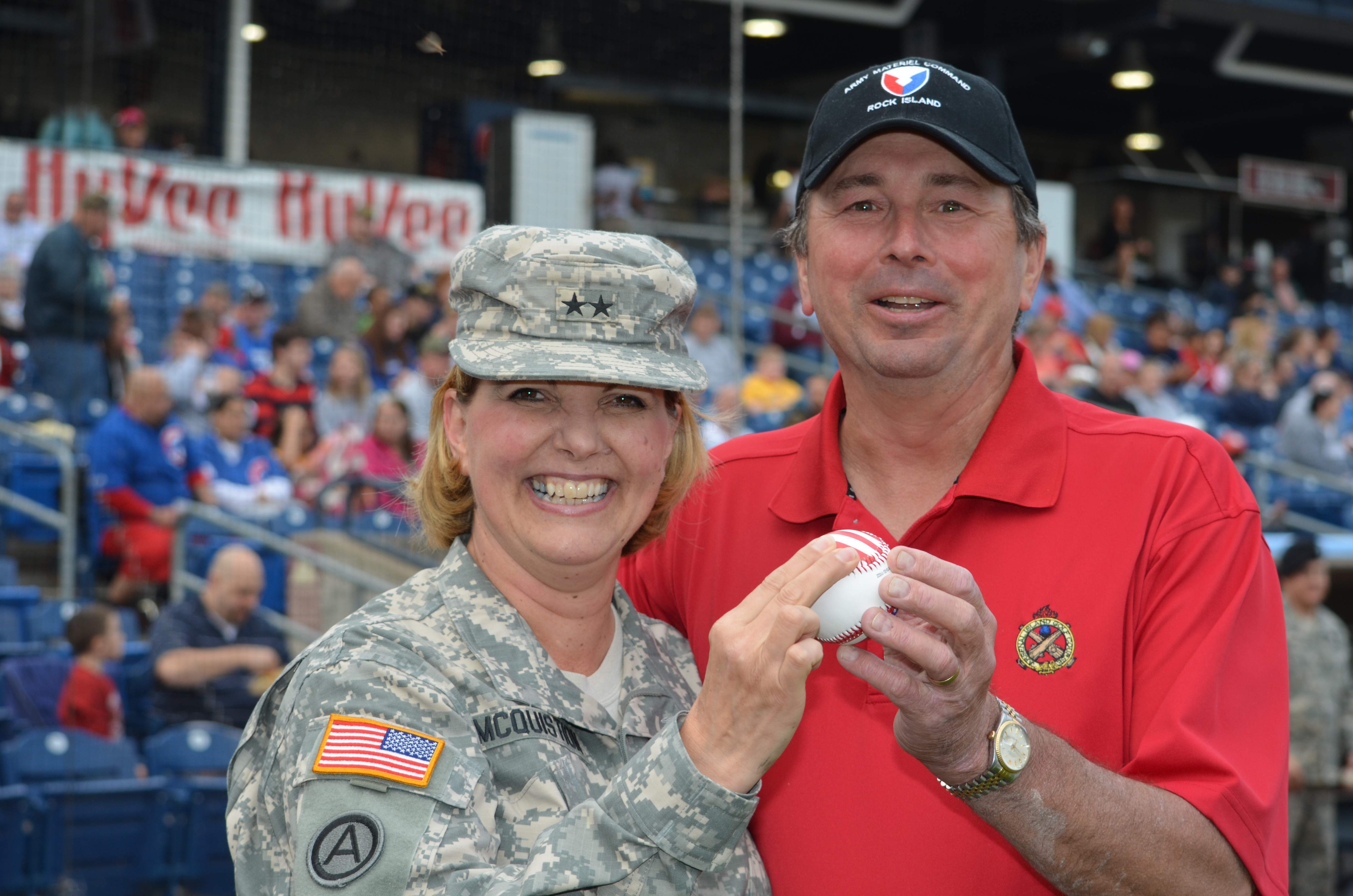 Maj. Gen. Patricia E. McQuistion, commanding general, Army Sustainment Command, prepares to throw out the first pitch at the AUSA Military Appreciation night at Modern Woodmen Park in Davenport, Iowa, May 12. The home team Quad Cities River Bandits...
