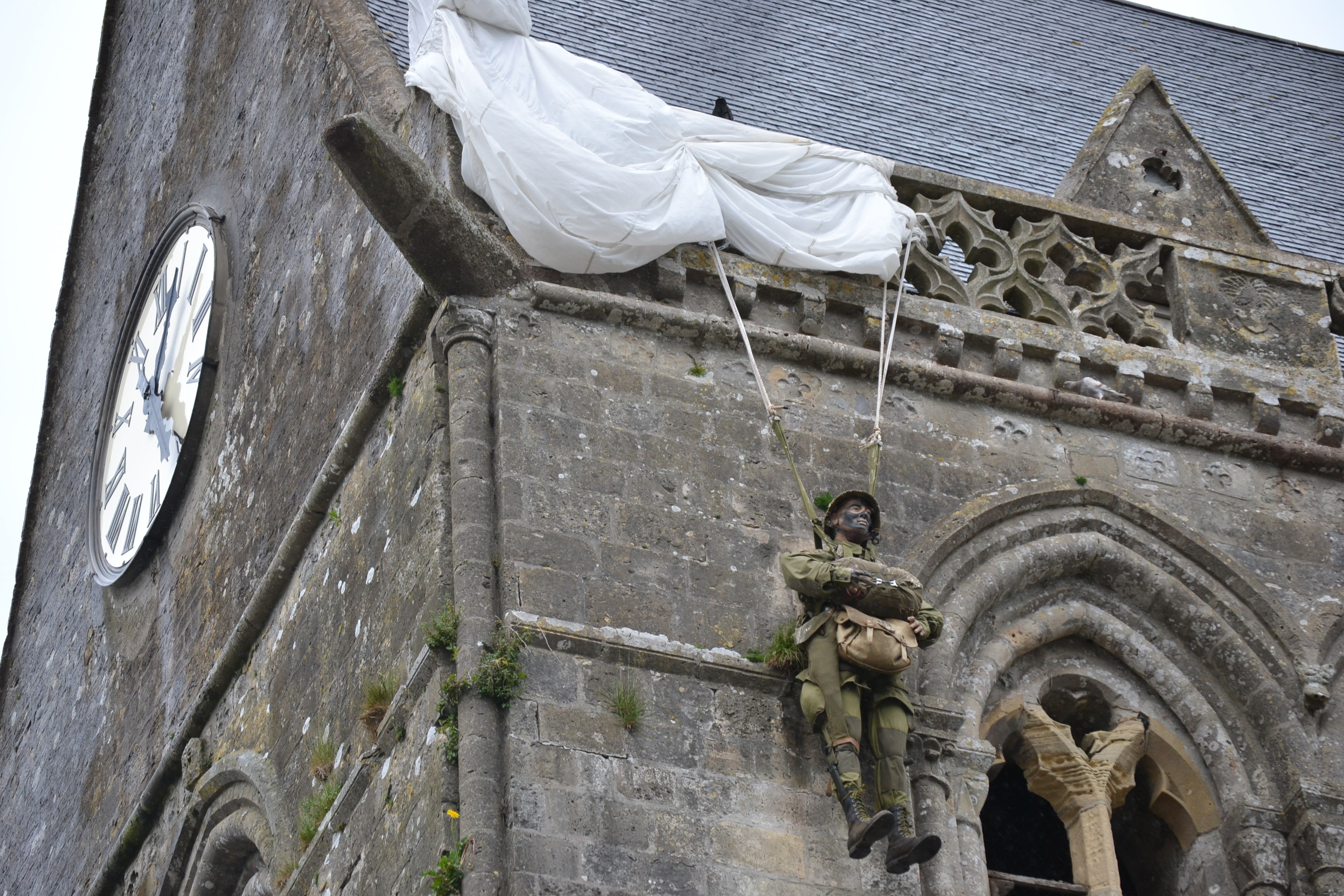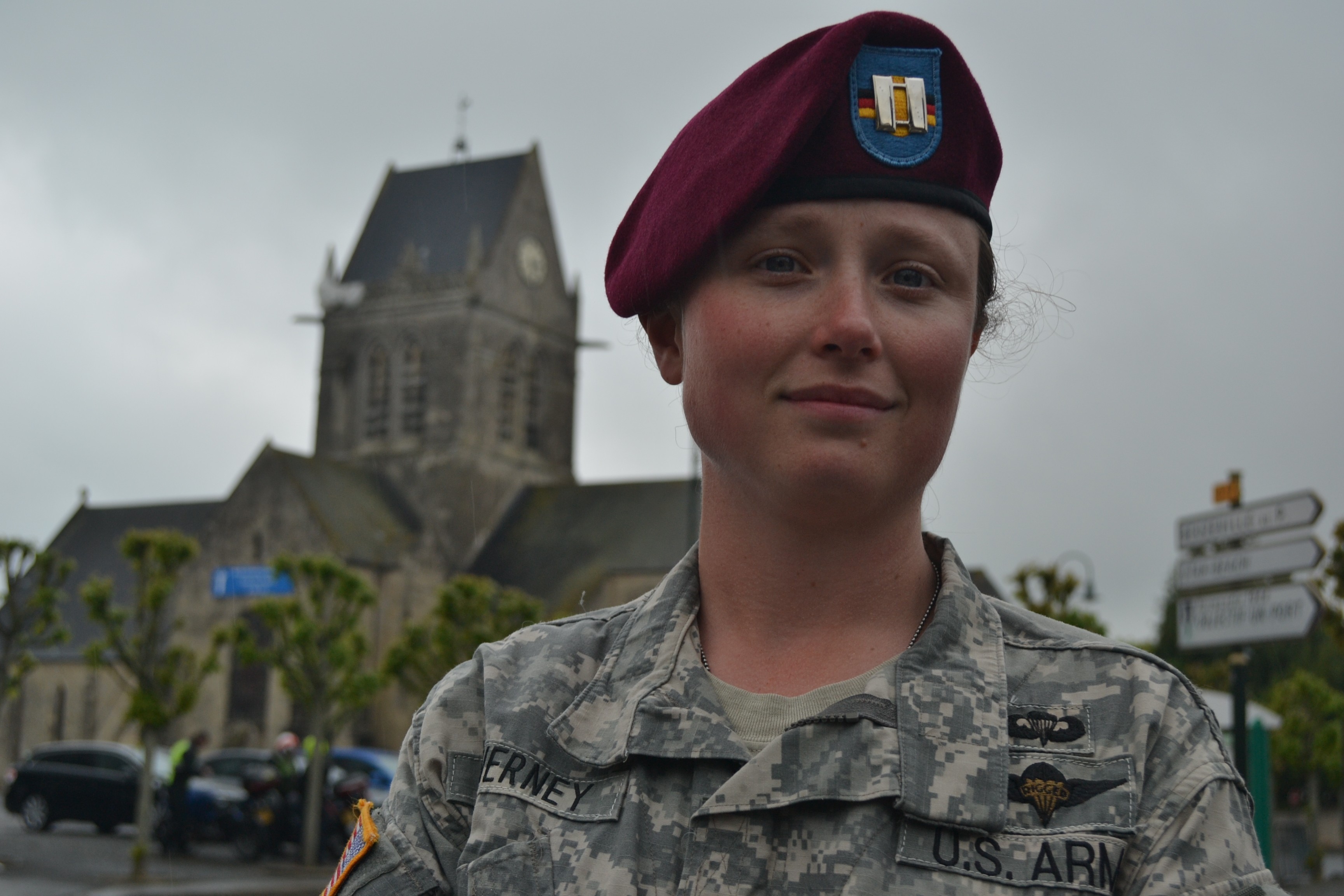 Shopping for souvenirs along Rue du Général de Gaulle, Sgt. Stephanie Cortez, a 25-year-old parachute rigger from Olympia, Wash., looked up at the church in the town square where a replica of Pvt. John Steele hangs by a parachute from the tower. Some of the fiercest fighting of the invasion took place here.