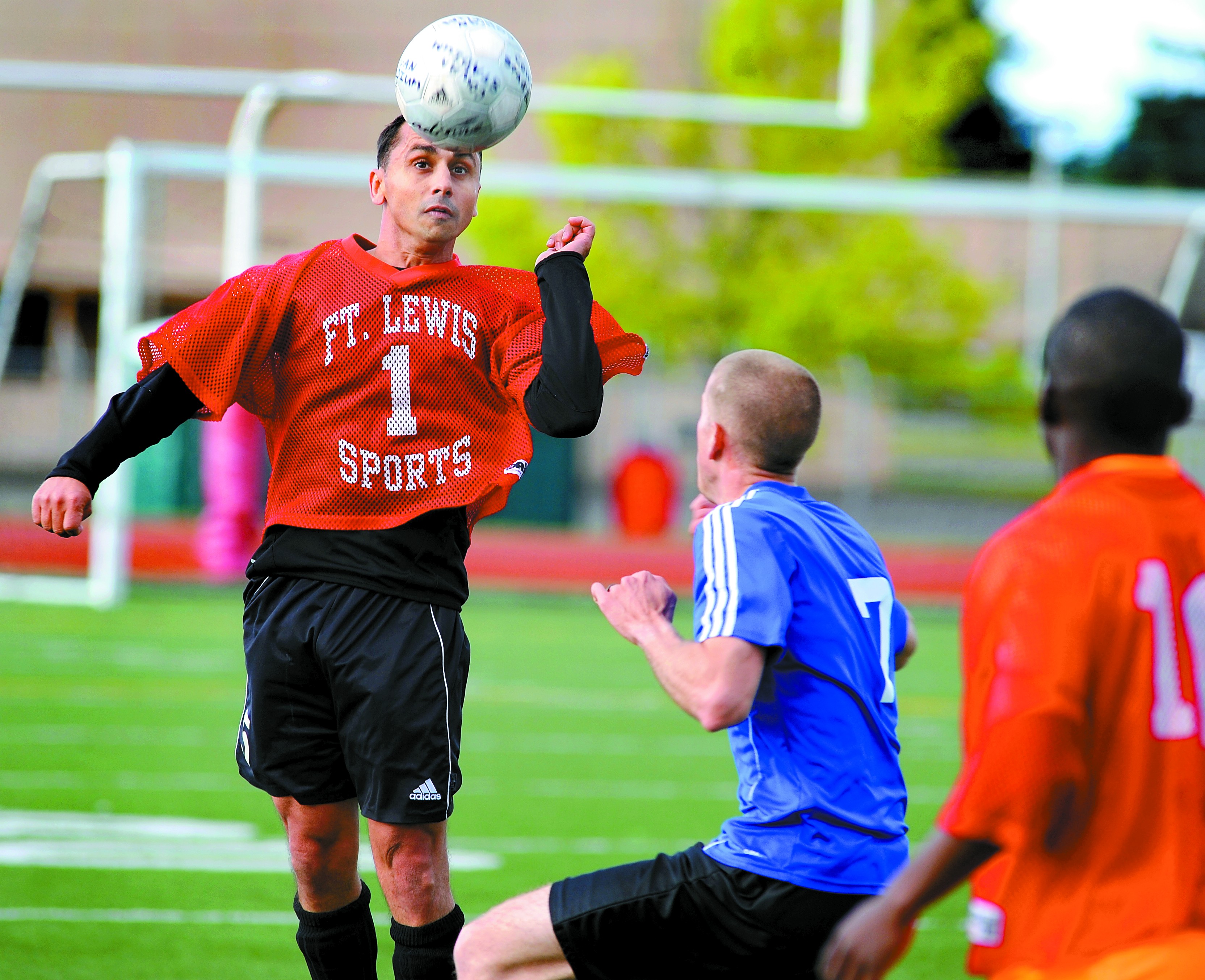 It was a purple evening with a green topping as 46th Aviation Support Battalion "Bellators" bested 62nd Aircraft Maintenance Squadron, 3-1, for the JBLM FMWR intramural soccer championship. The backfield play of the Bellators' David Essi (assist, 6 steals) and his late-match kick start of a sometimes disorganized attack were vital in a match that saw his team outshoot 62nd AMXS, 23-6.