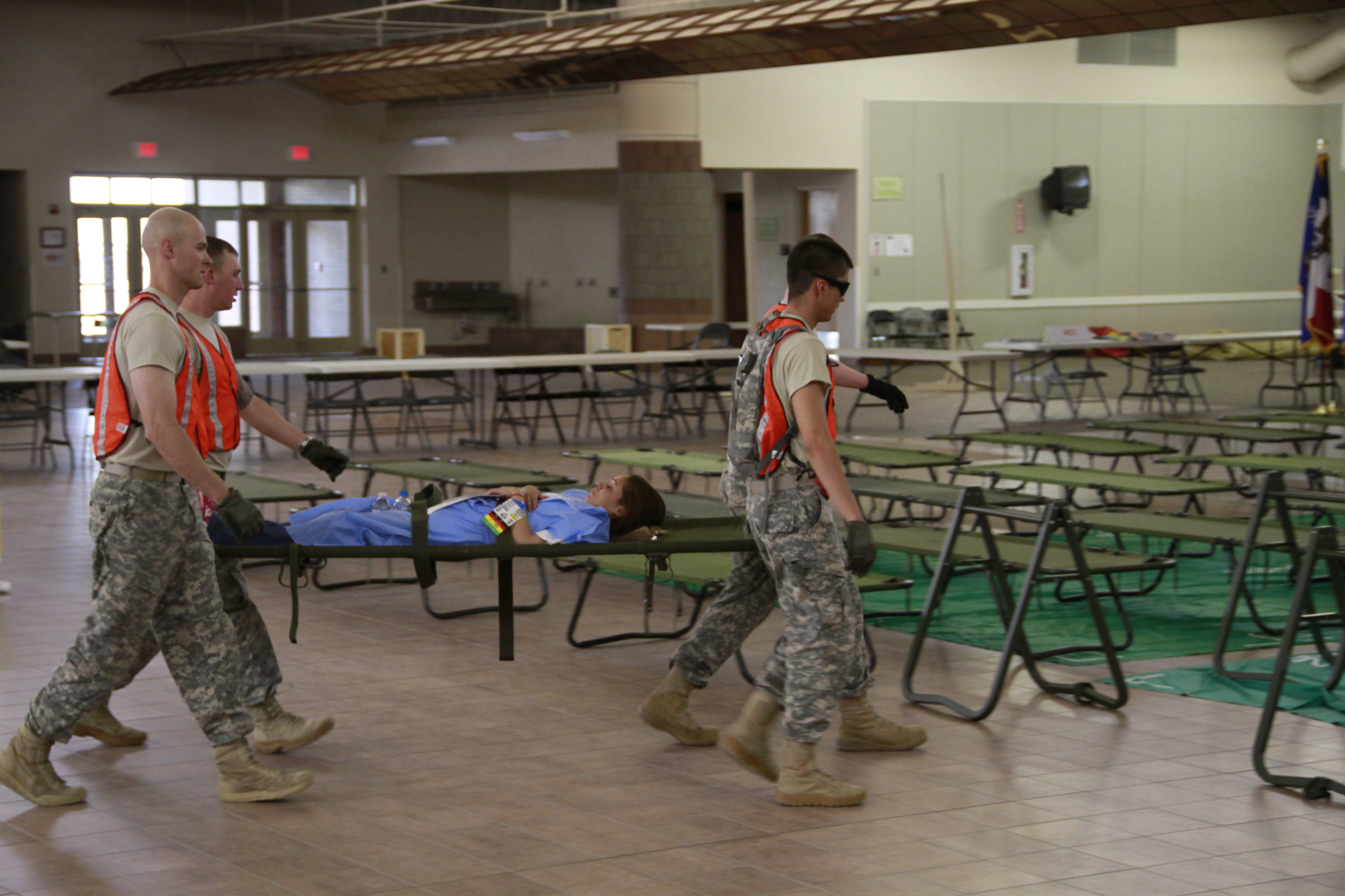 Emergency medical technicians lined up with their gurneys as personnel began transporting mock hurricane victims off of buses.