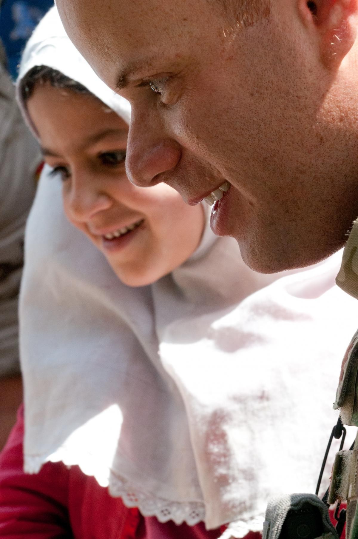 International Security Assistance Force Chaplain, Capt. Antonio Ortiz Guzman with an orphan during a donation mission at an girl's orphanage in Kabul, Afghanistan, May 31. Ortiz led an ISAF volunteer community relations program which helps local popu... (Photo Credit: U.S. Army) VIEW ORIGINAL