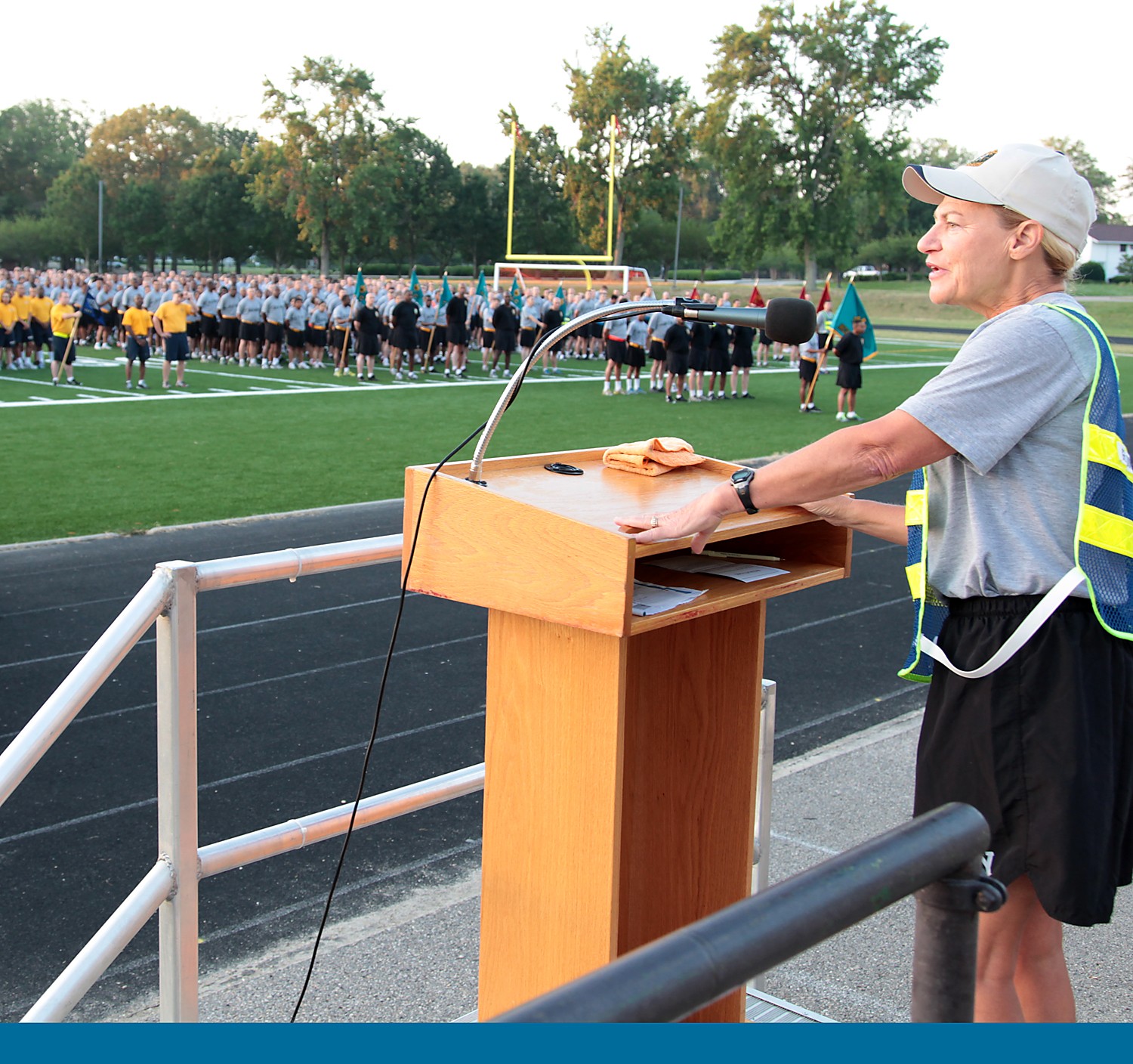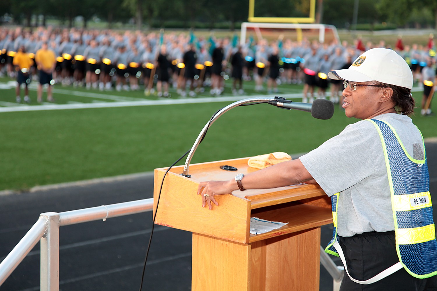 Brig. Gen. Gwen Bingham, Quartermaster General and QM School commandant, shares some early morning motivation with nearly 2,000 QM School personnel before heading out on a spirited run around Fort Lee, Va., Friday morning. The event was just one of t...