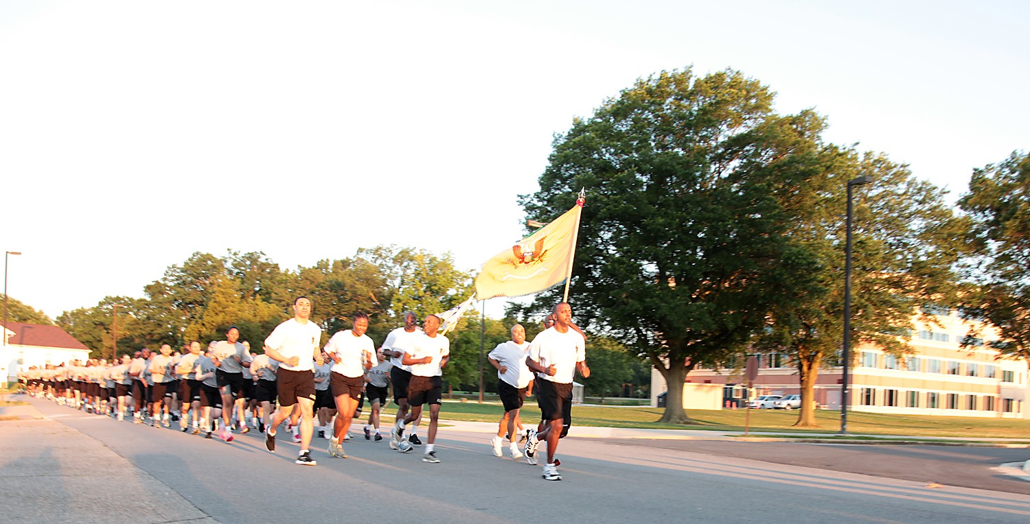 Lt. Col. Derell Bibbs, 244th Quartermaster Battalion commander, leads his Soldiers pass the headquarters of the Combined Arms Support Command during the 2012 QM spirit run Friday morning on Fort Lee, Va. Nearly 2,000 QM School personnel participated ...